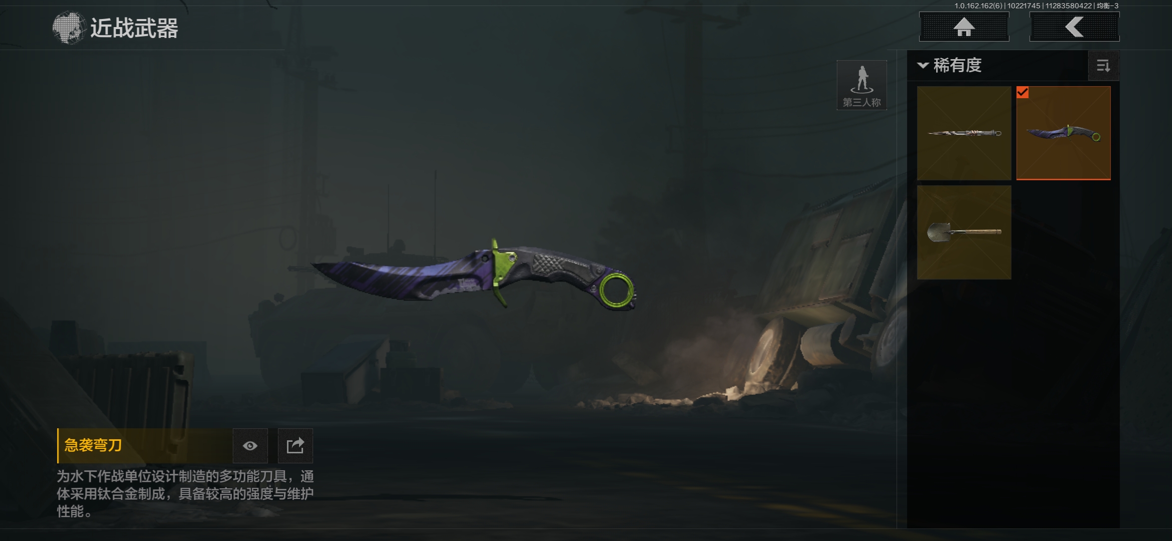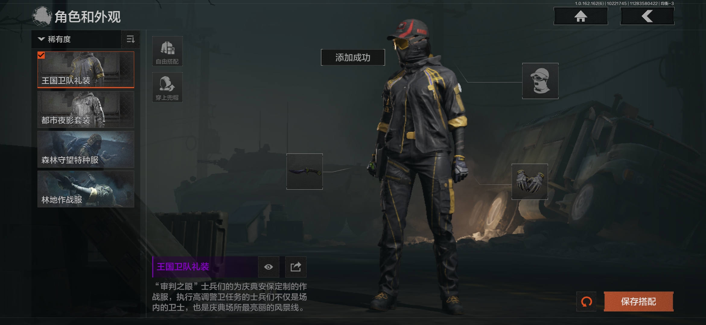 FY5645,总资产113.8m,近战武器:,急袭弯刀,盘牙·彻甲短刃,角色装扮(紫):,王国卫队礼