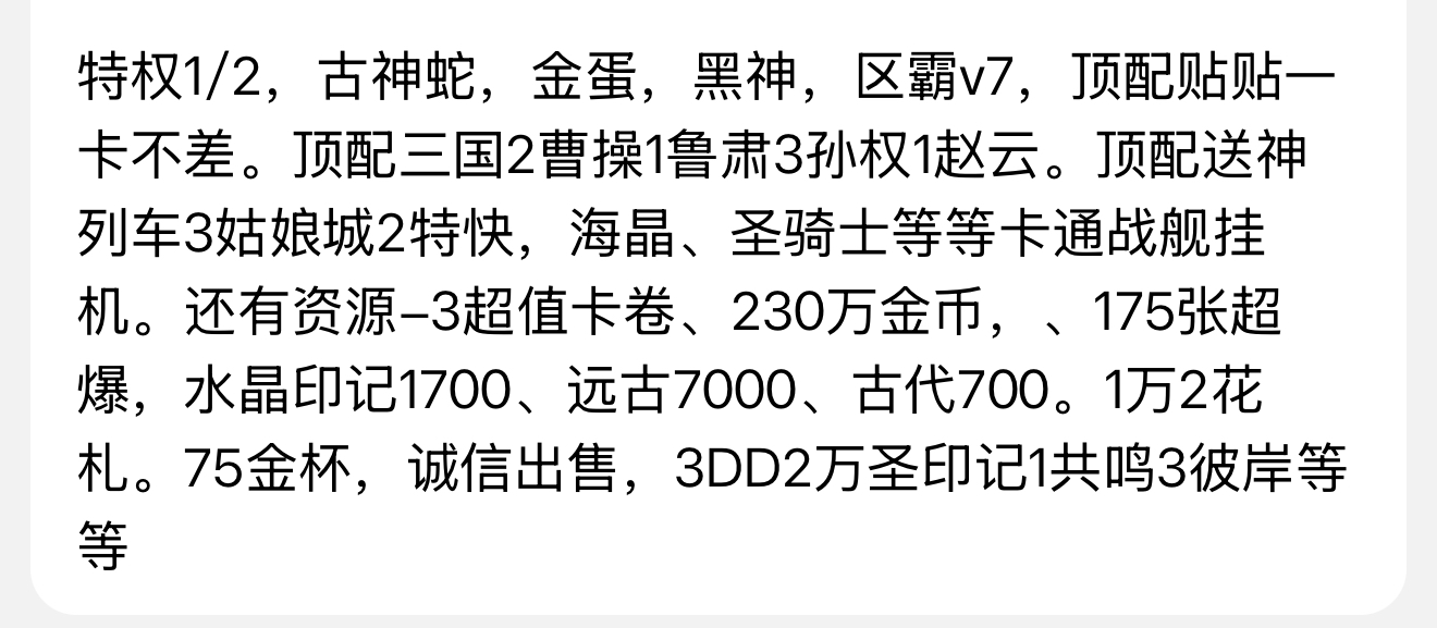 特权1/2,古神蛇,金蛋,黑神,区霸v7,顶配贴贴一卡不差。顶配三国2曹操1鲁肃3孙权1赵云。顶配送神列车3姑娘城2特快,海晶、圣骑士等资源-3超值卡卷、230万金币,3DD2万圣印记1共鸣3彼岸等等