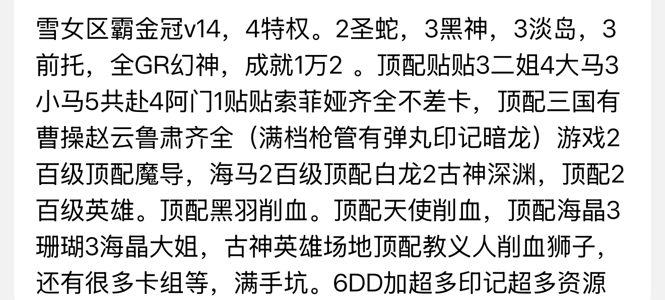 雪女区霸金冠v14,4特权。2圣蛇,3黑神,3淡岛,3前托,全GR幻神,成就1万2 。顶配贴贴3二姐4大马3小马5共赴4阿门1贴贴索菲娅齐全不差卡,顶配三国有曹操赵云鲁肃齐全(满档枪管有弹丸印记暗龙)