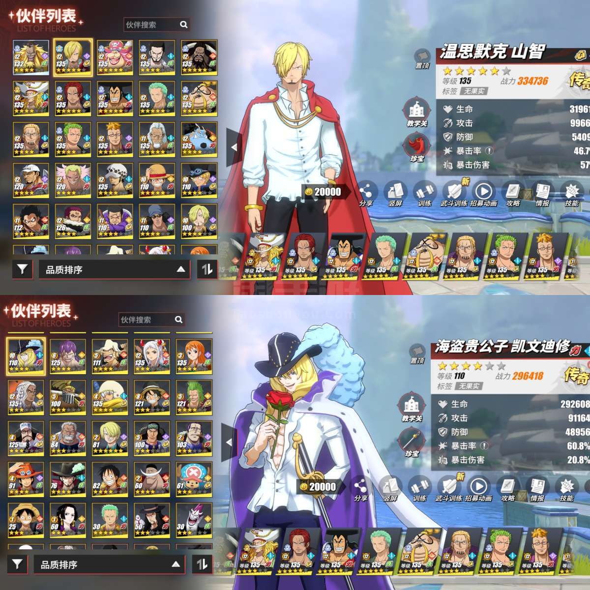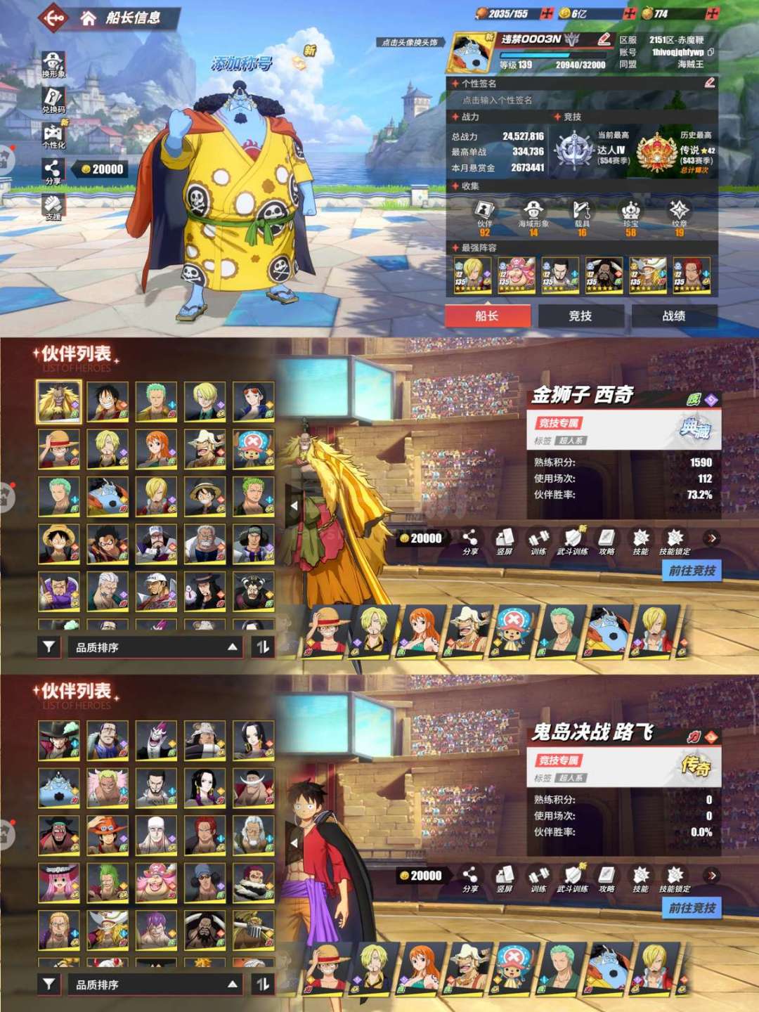 航海王热血航线【安卓华为】2400万竞技60传奇9强者单战最高33万。多热门伙伴角色鬼路已出 和马 和罗 和佐 大和 卡二