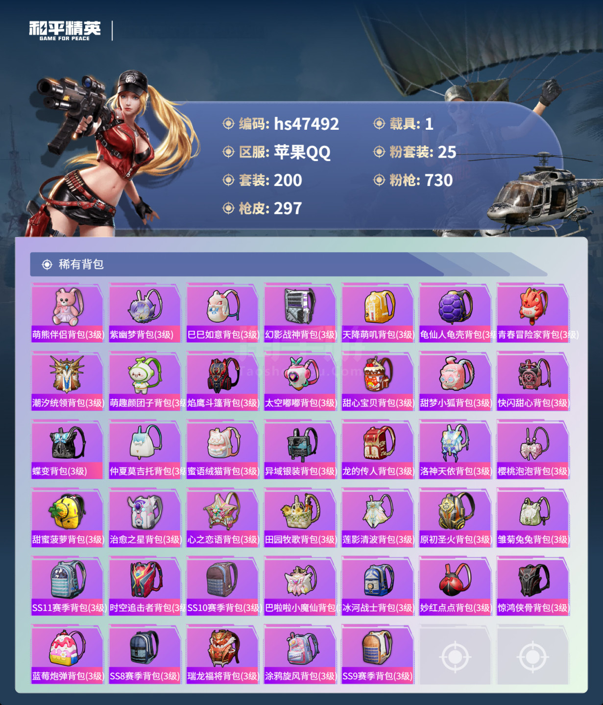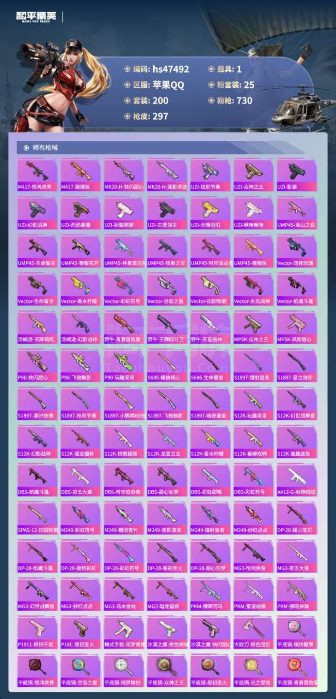hs47492 苹果手Q-19王牌印记-25粉装-9特效枪-1载具-104548热力值-200套装-