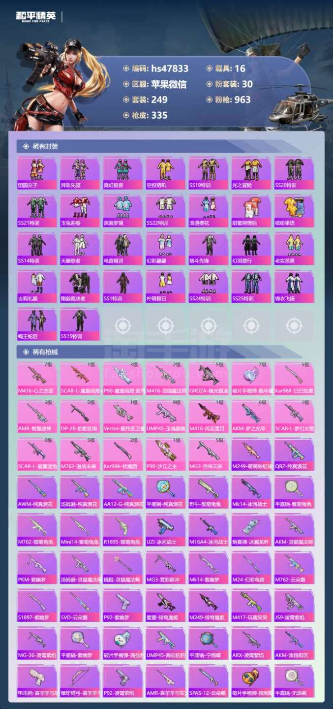 hs47833 苹果微-24王牌印记-4红装-30粉装-19特效枪-16载具-166483热力值-