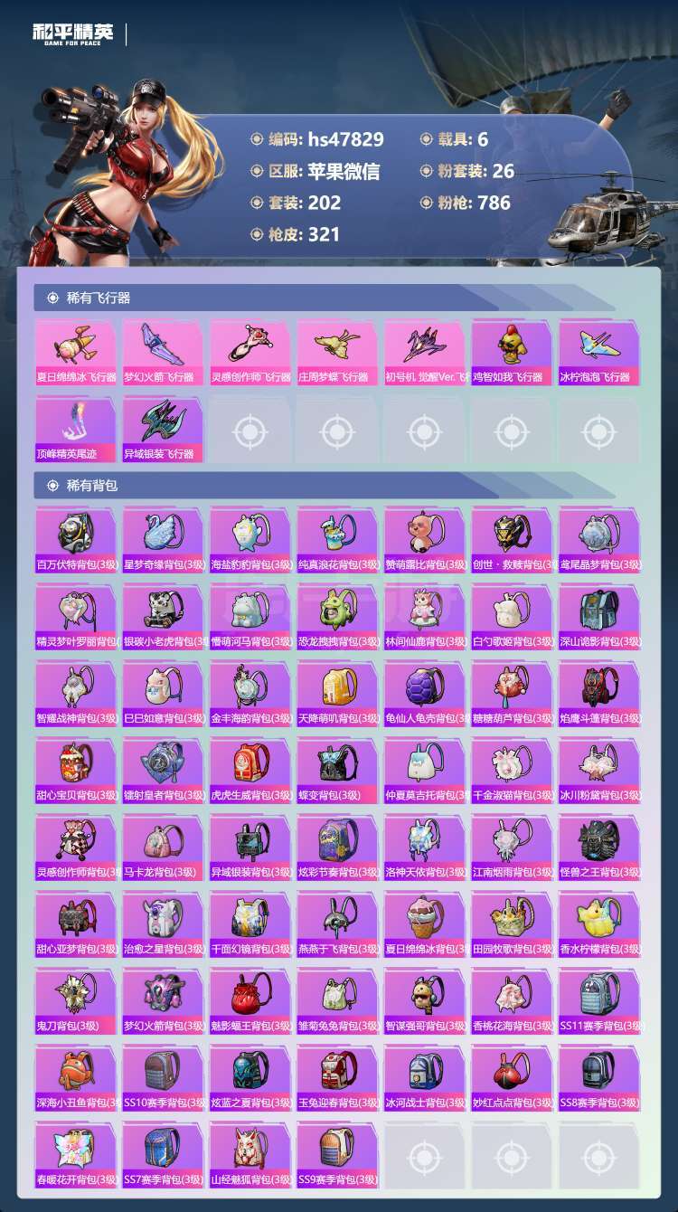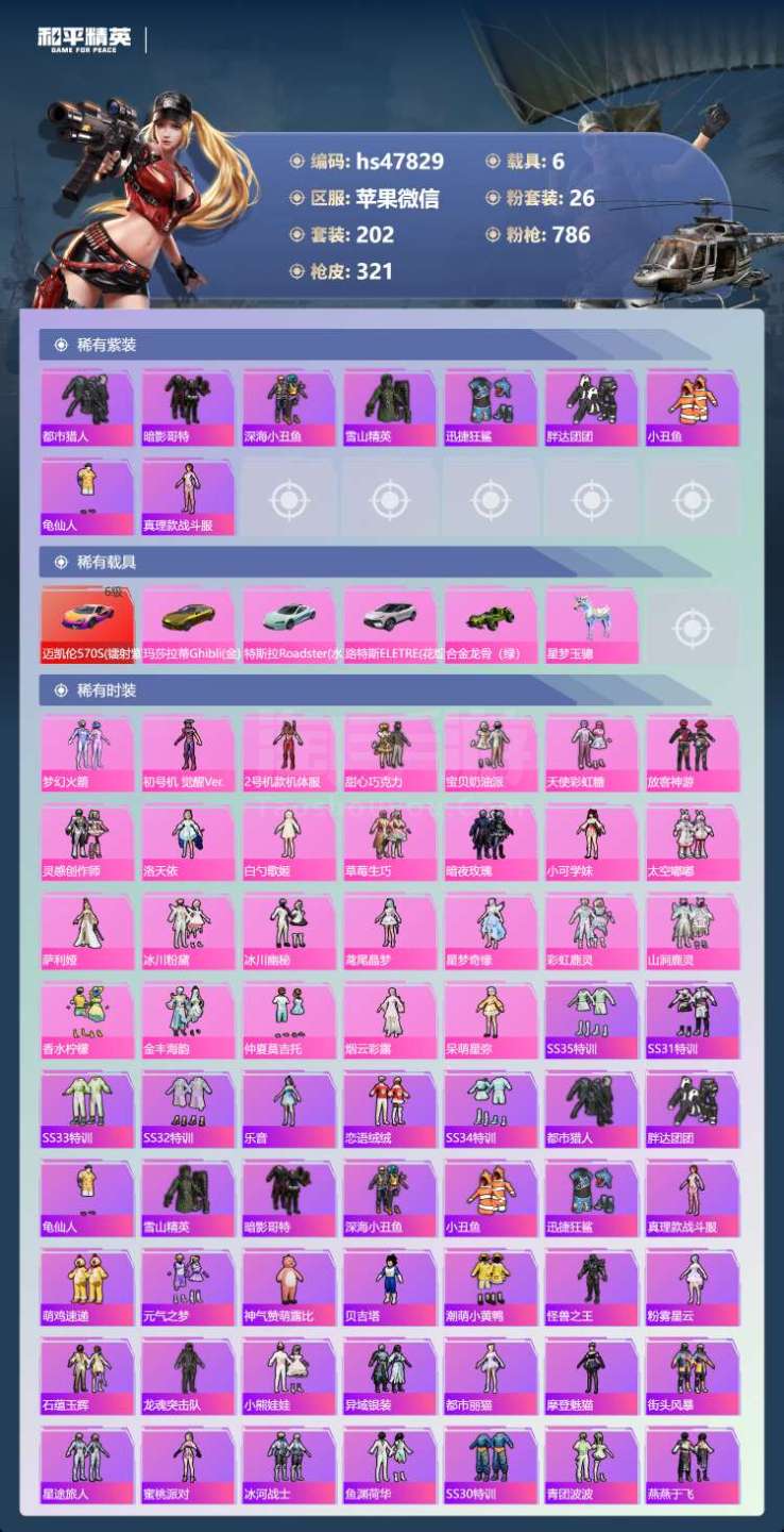 hs47829 苹果微-25王牌印记-26粉装-14特效枪-6载具-128517热力值-202套装