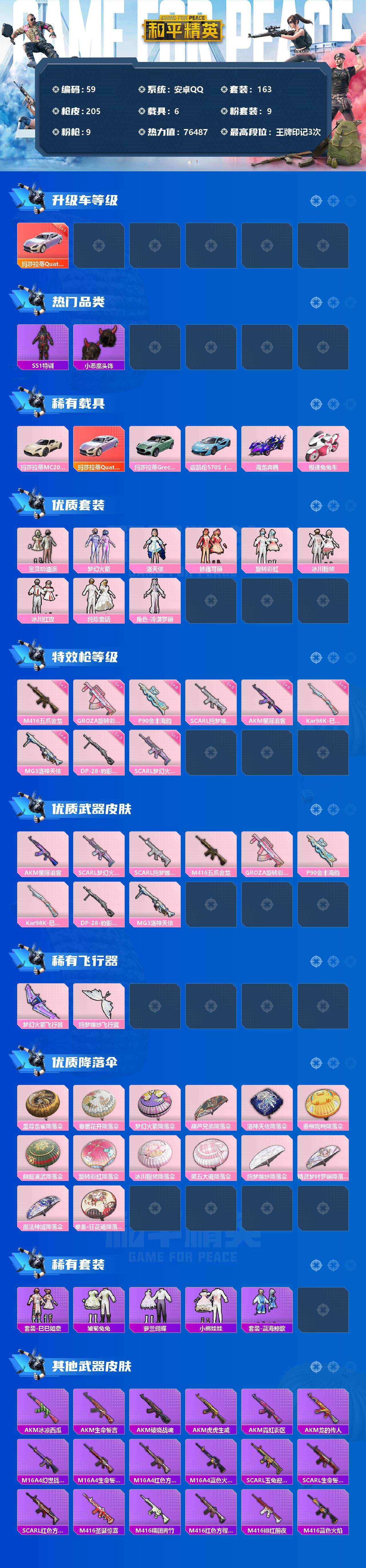 【59】【商品标题】:安卓 手Q-9粉装-9特效枪-6载具-2粉色飞行器-76487热力值-3王牌印记-163套装-205枪皮