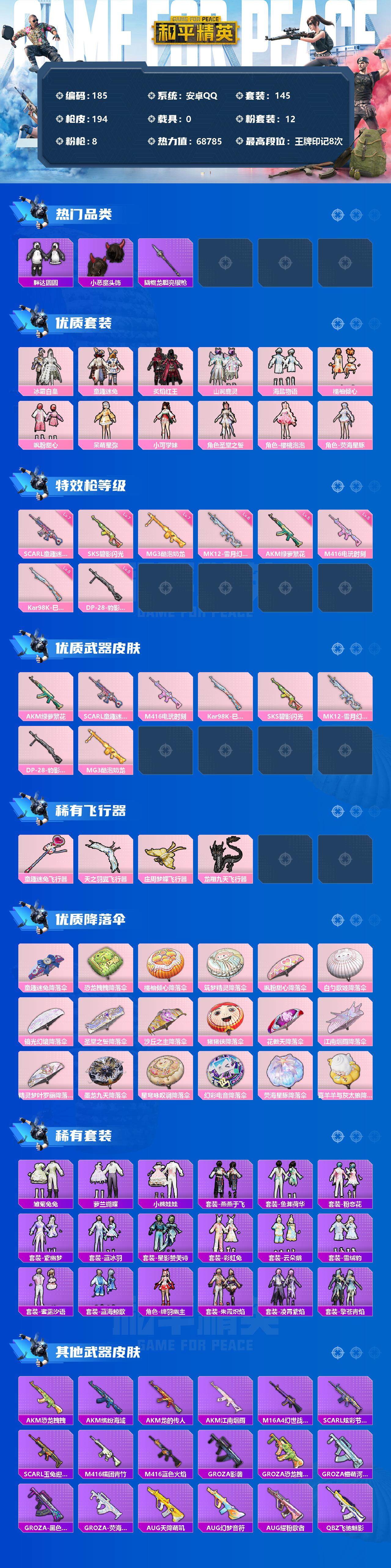 【185】【商品标题】:安卓 手Q-12粉装-8特效枪-0载具-5粉色飞行器-68785热力值-8王牌印记-145套装-194枪皮