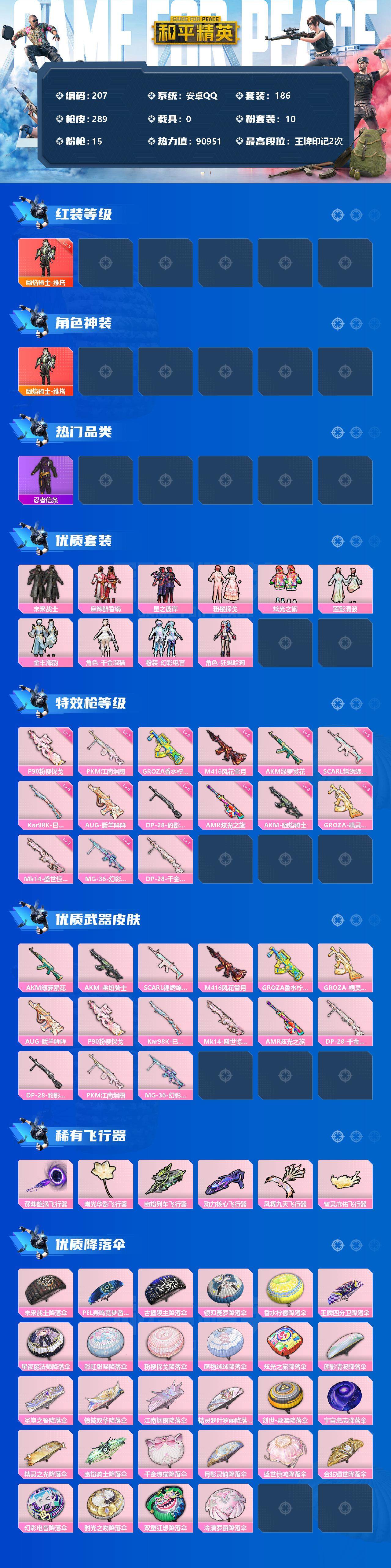 【207】【商品标题】:安卓 手Q-1神装-10粉装-15特效枪-0载具-7粉色飞行器-90951热力值-2王牌印记-186套装-289枪皮