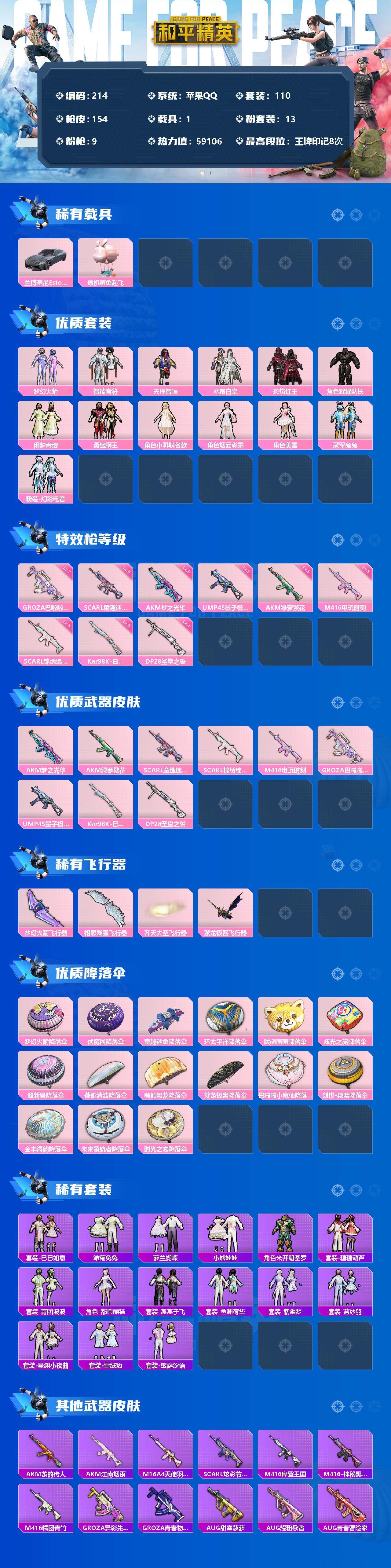 【214】【商品标题】:苹果 手Q-13粉装-9特效枪-1载具-5粉色飞行器-59106热力值-8王牌印记-110套装-154枪皮