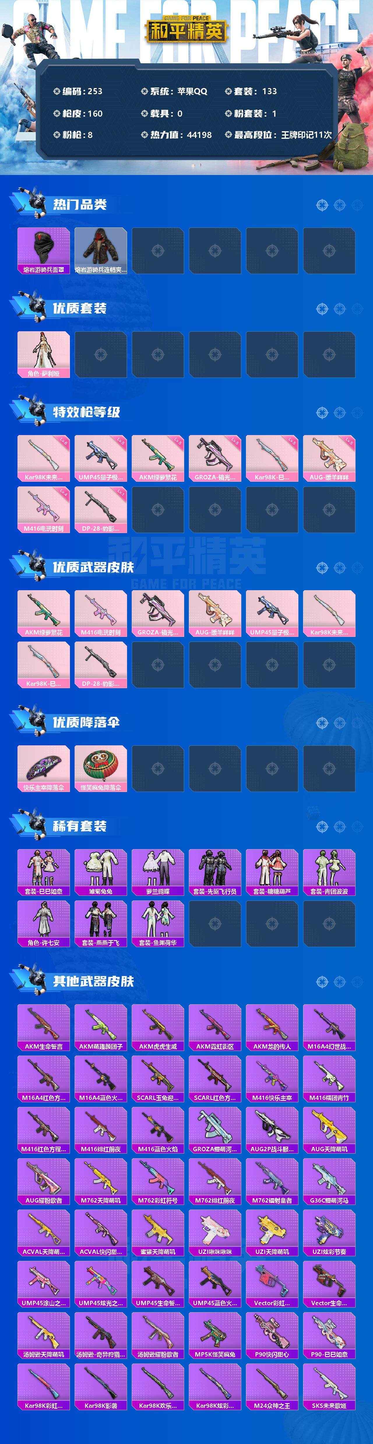 【253】【商品标题】:苹果 手Q-1粉装-8特效枪-0载具-0粉色飞行器-44198热力值-11王牌印记-133套装-160枪皮