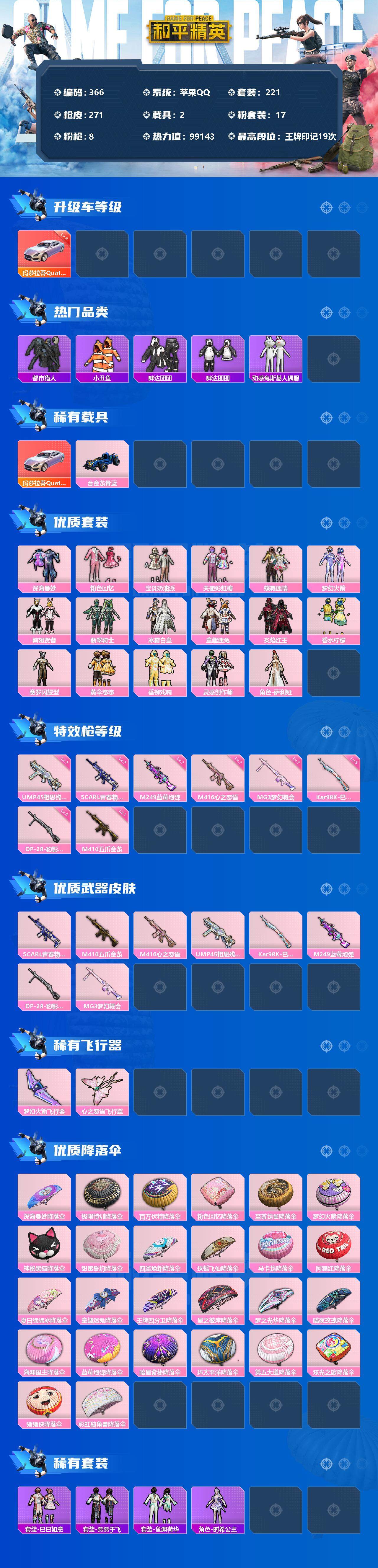 【366】【商品标题】:苹果 手Q-17粉装-8特效枪-2载具-2粉色飞行器-99143热力值-19王牌印记-221套装-271枪皮