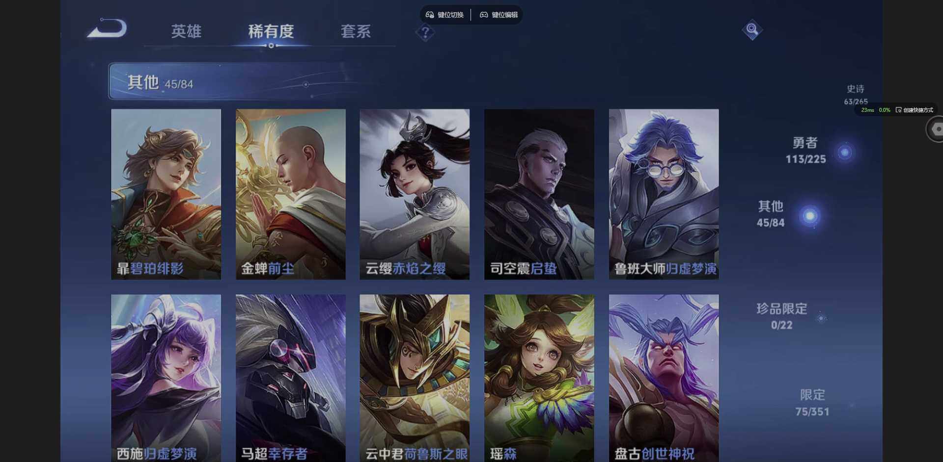 实名: 可修改 贵族等级: V8 英雄数: 125 皮肤数: 236 荣耀水晶