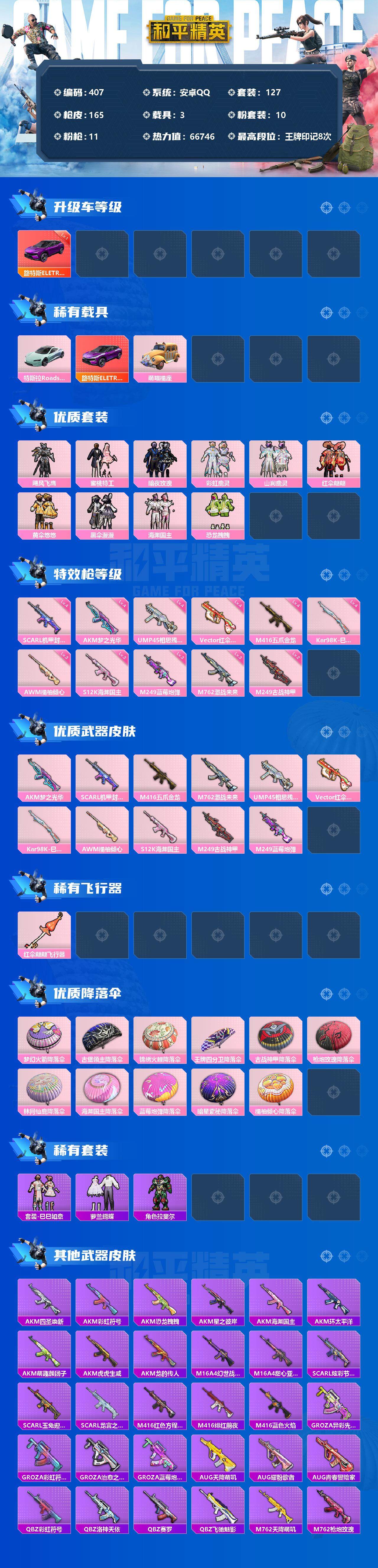 【407】【商品标题】:安卓 手Q-10粉装-11特效枪-3载具-1粉色飞行器-66746热力值-8王牌印记-127套装-165枪皮