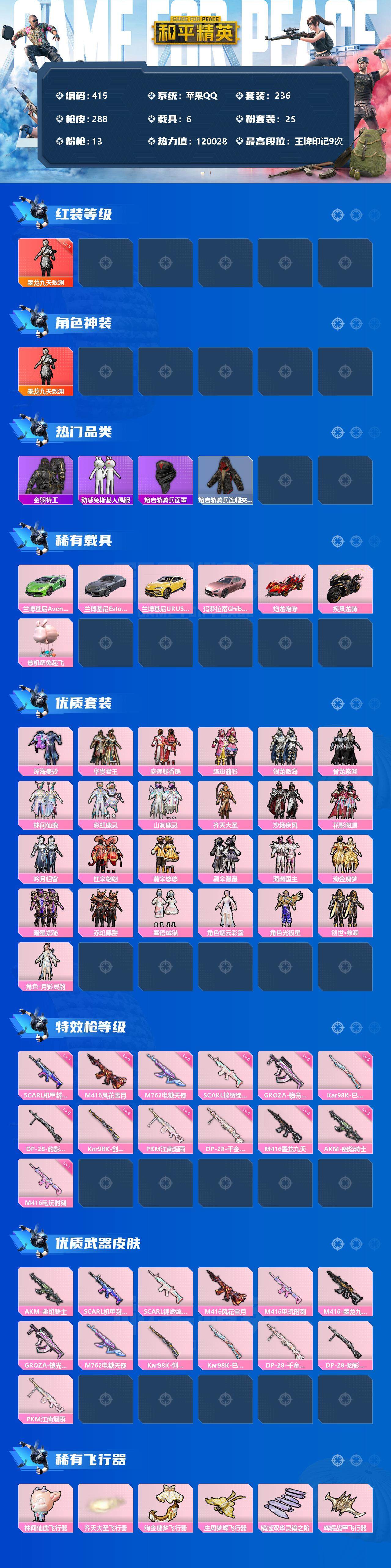 【415】【商品标题】:苹果 手Q-1神装-25粉装-13特效枪-6载具-11粉色飞行器-120028热力值-9王牌印记-236套装-288枪皮