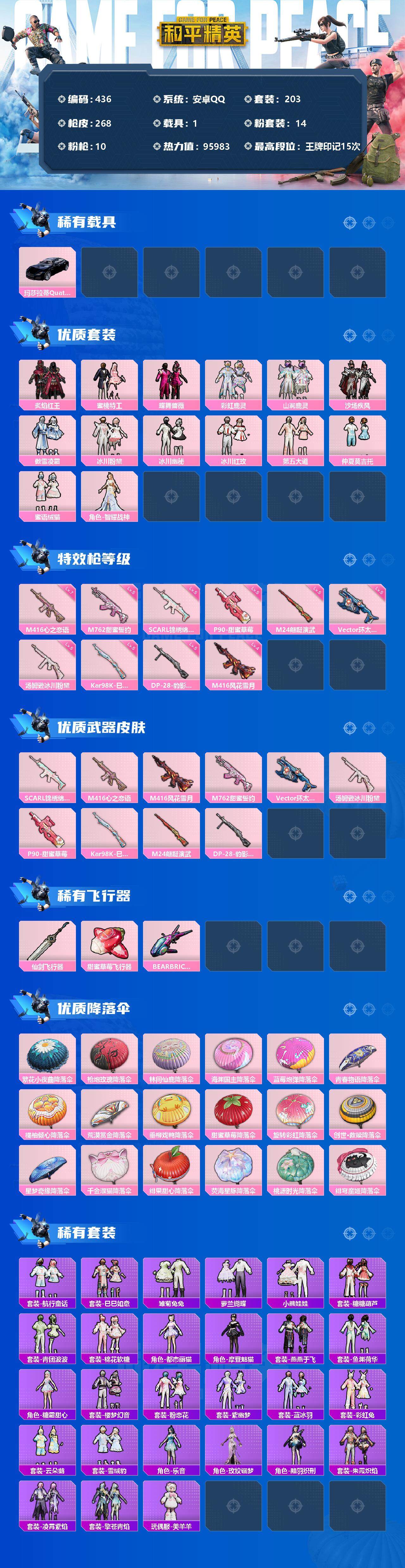 【436】【商品标题】:安卓 手Q-14粉装-10特效枪-1载具-3粉色飞行器-95983热力值-15王牌印记-203套装-268枪皮