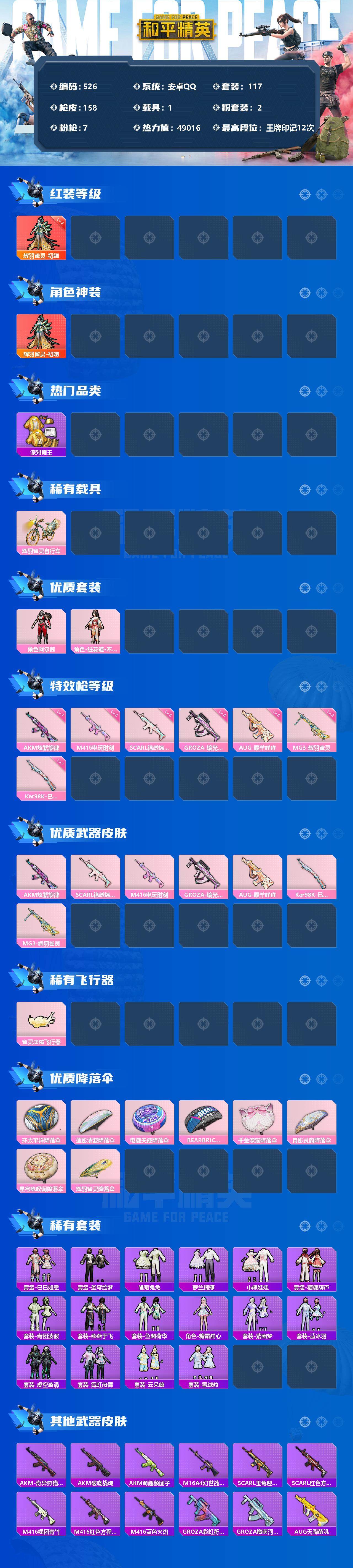 【526】【商品标题】:安卓 手Q-1神装-2粉装-7特效枪-1载具-1粉色飞行器-49016热力值-12王牌印记-117套装-158枪皮