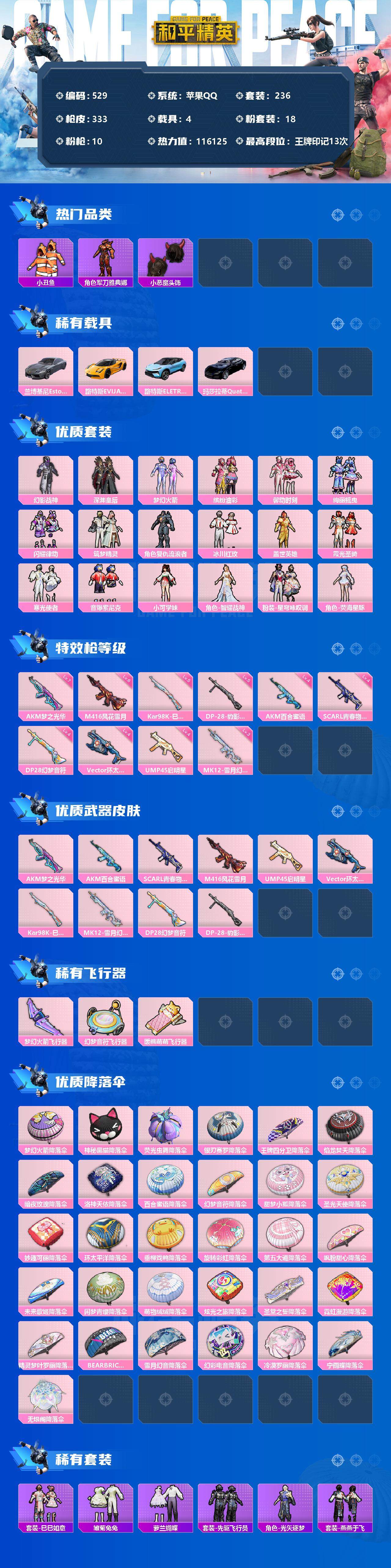 【529】【商品标题】:苹果 手Q-18粉装-10特效枪-4载具-3粉色飞行器-116125热力值-13王牌印记-236套装-333枪皮