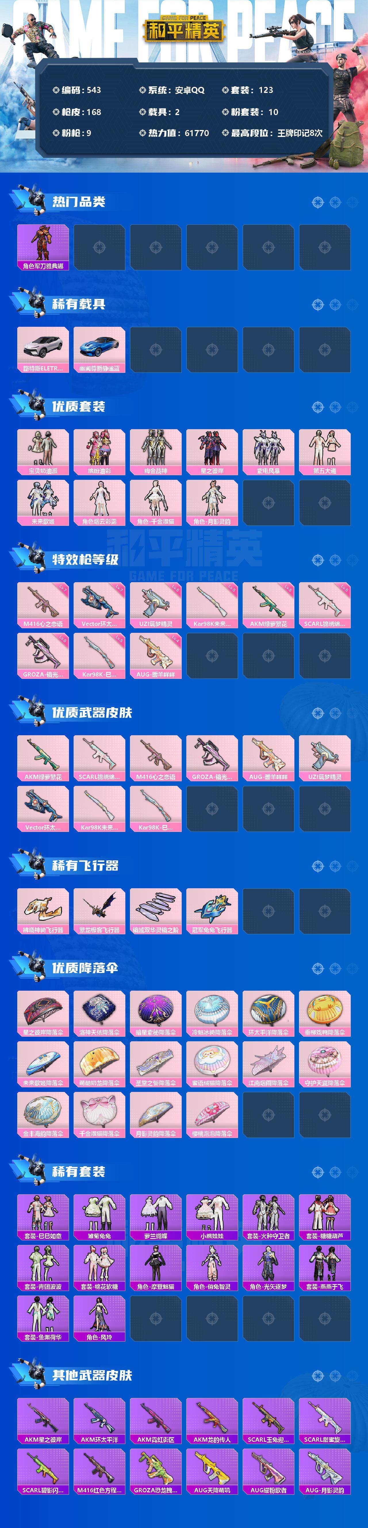 【543】【商品标题】:安卓 手Q-10粉装-9特效枪-2载具-4粉色飞行器-61770热力值-8王牌印记-123套装-168枪皮
