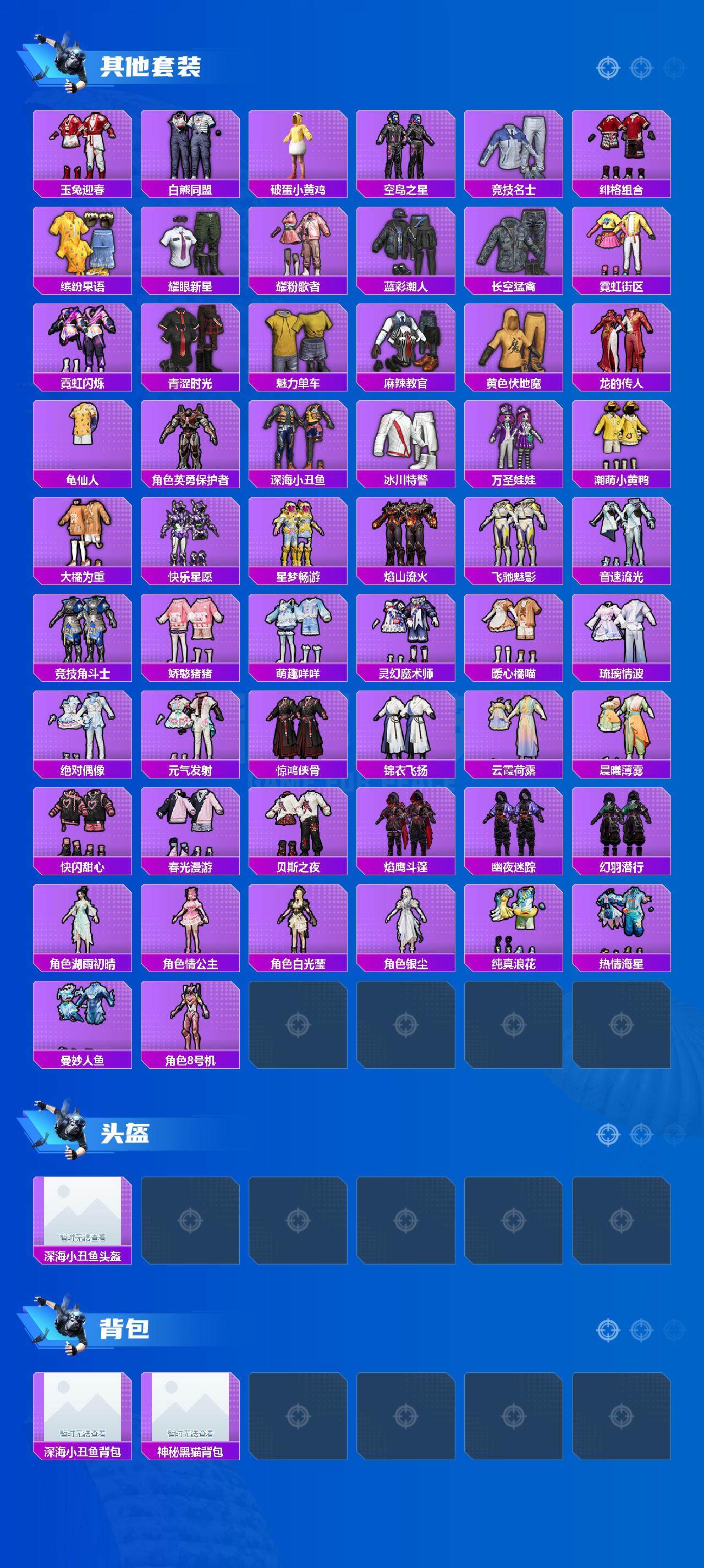 【热门品类】:粉装-缤纷油彩,套装-浪漫天命,套装-深海小丑鱼,角色-军刀雅典娜,套装-龟仙人,套装-潮萌小黄鸭,角色-8号机