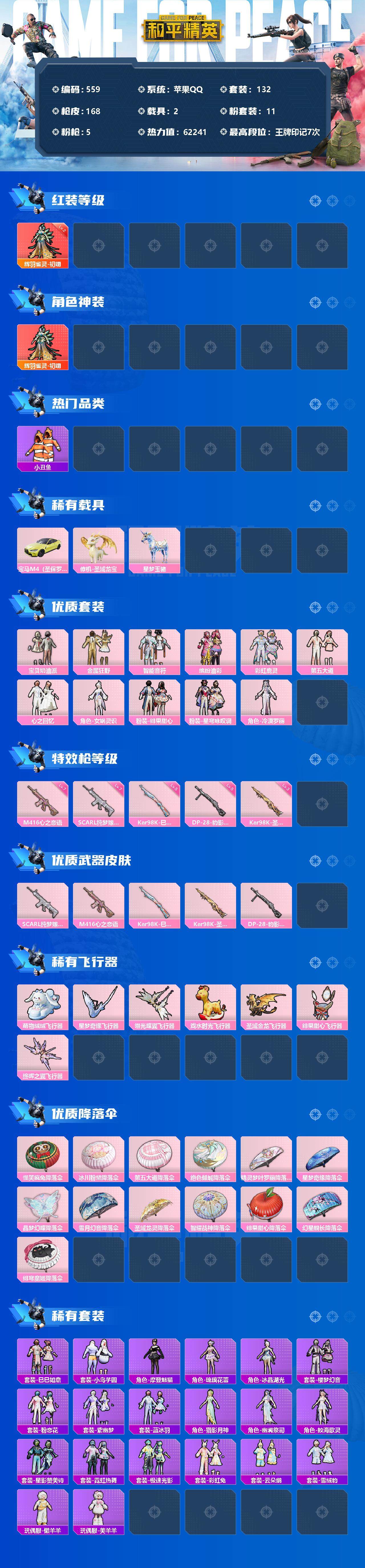 【559】【商品标题】:苹果 手Q-1神装-11粉装-5特效枪-2载具-7粉色飞行器-62241热力值-7王牌印记-132套装-168枪皮