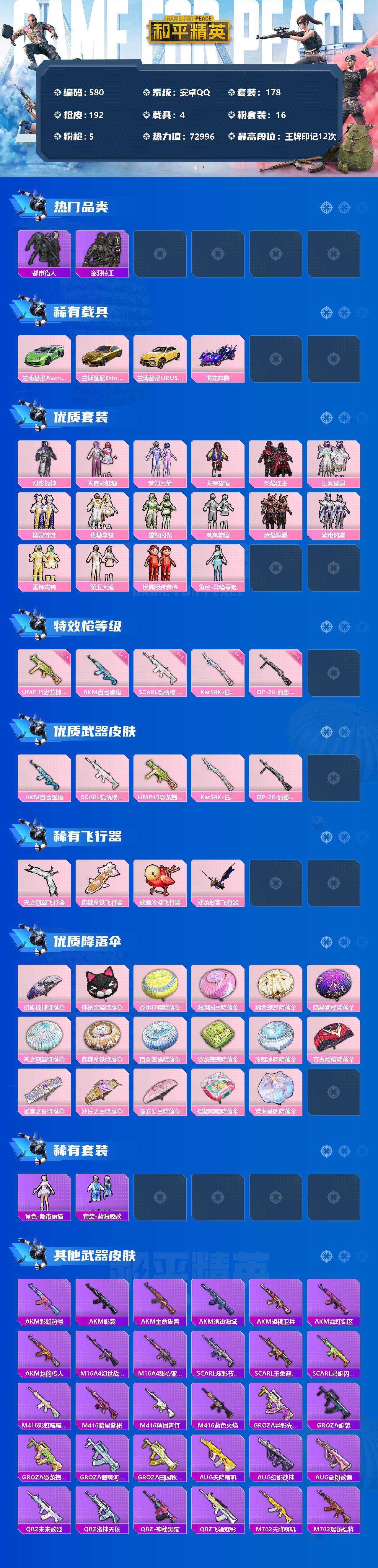【580】【商品标题】:安卓 手Q-16粉装-5特效枪-4载具-4粉色飞行器-72996热力值-12王牌印记-178套装-192枪皮