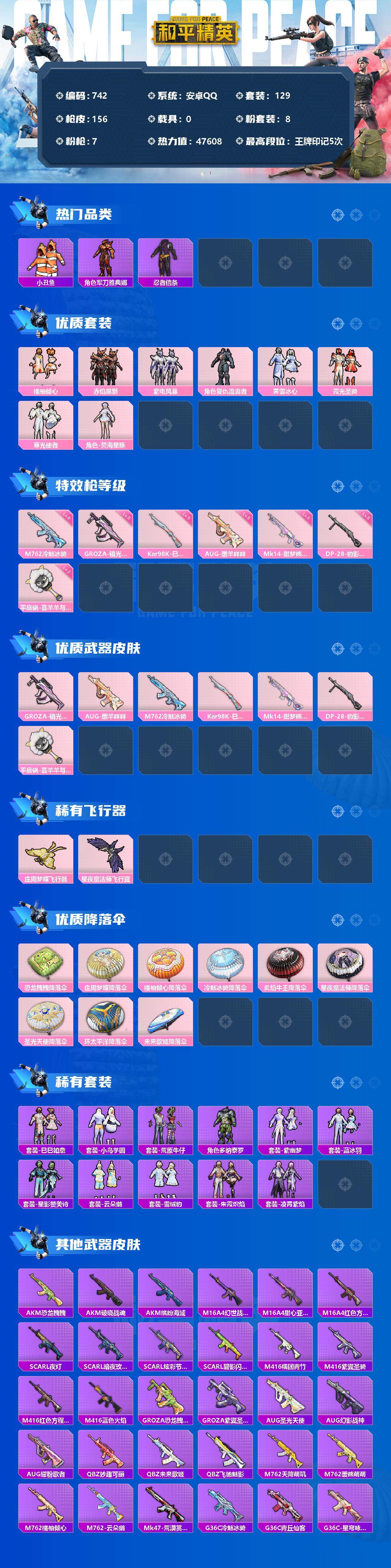 【742】【商品标题】:安卓 手Q-8粉装-7特效枪-0载具-2粉色飞行器-47608热力值-5王牌印记-129套装-156枪皮