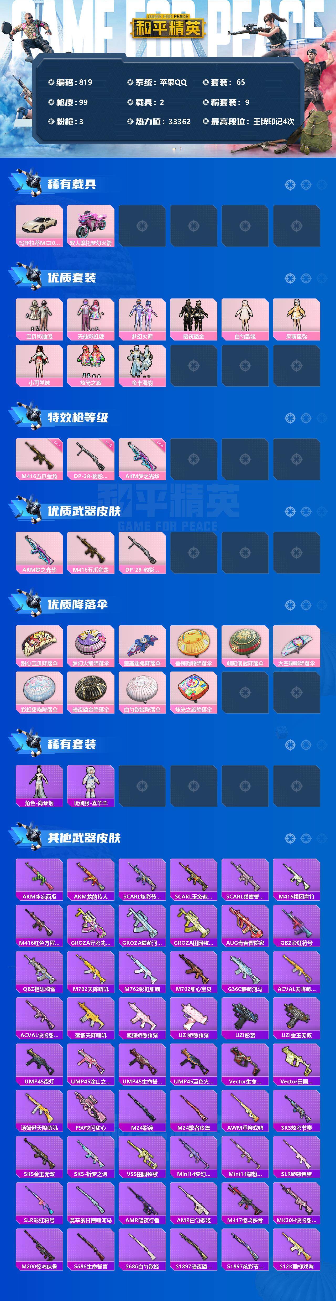 【819】【商品标题】:苹果 手Q-9粉装-3特效枪-2载具-0粉色飞行器-33362热力值-4王牌印记-65套装-99枪皮