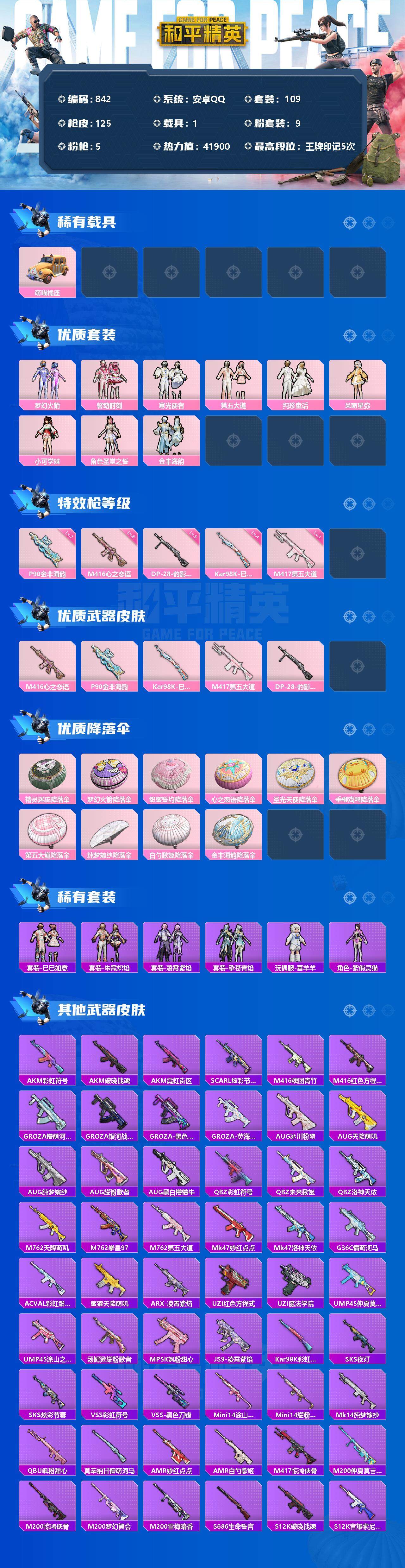 【842】【商品标题】:安卓 手Q-9粉装-5特效枪-1载具-0粉色飞行器-41900热力值-5王牌印记-109套装-125枪皮