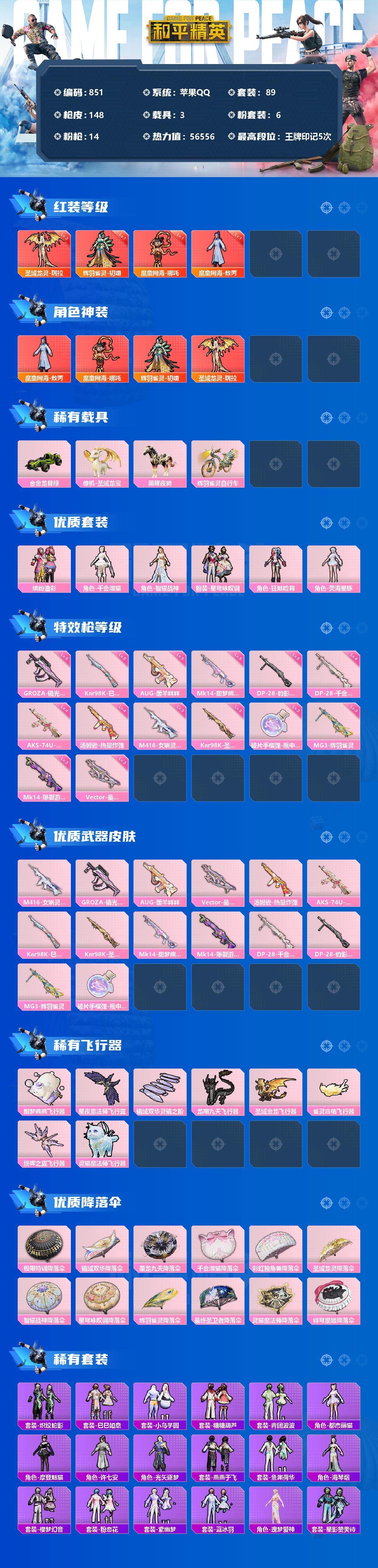【851】【商品标题】:苹果 手Q-4神装-6粉装-14特效枪-3载具-9粉色飞行器-56556热力值-5王牌印记-89套装-148枪皮