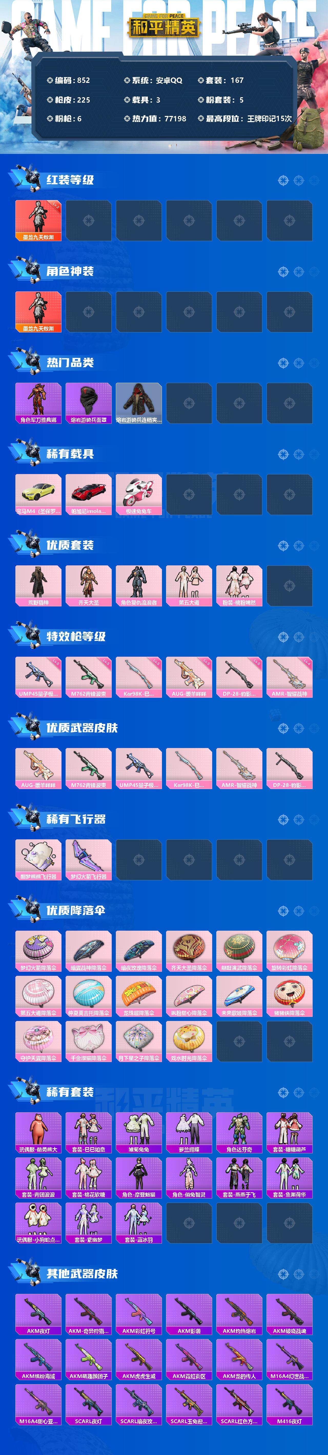 【852】【商品标题】:安卓 手Q-1神装-5粉装-6特效枪-3载具-3粉色飞行器-77198热力值-15王牌印记-167套装-225枪皮