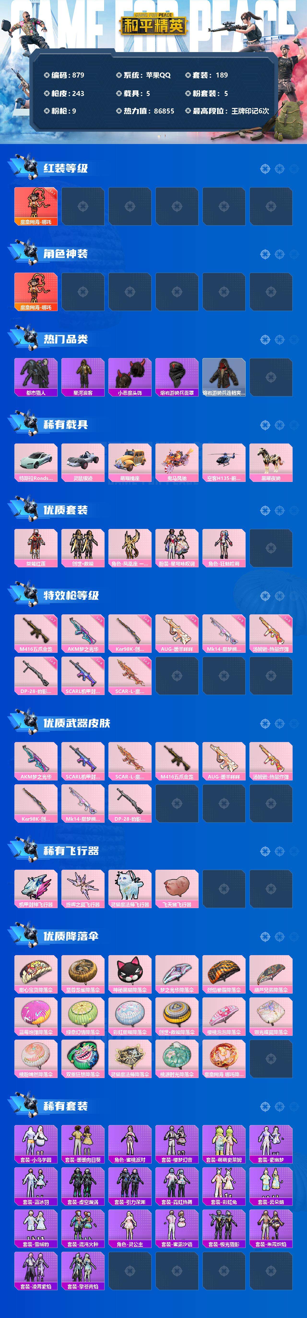 【879】【商品标题】:苹果 手Q-1神装-5粉装-9特效枪-5载具-5粉色飞行器-86855热力值-6王牌印记-189套装-243枪皮