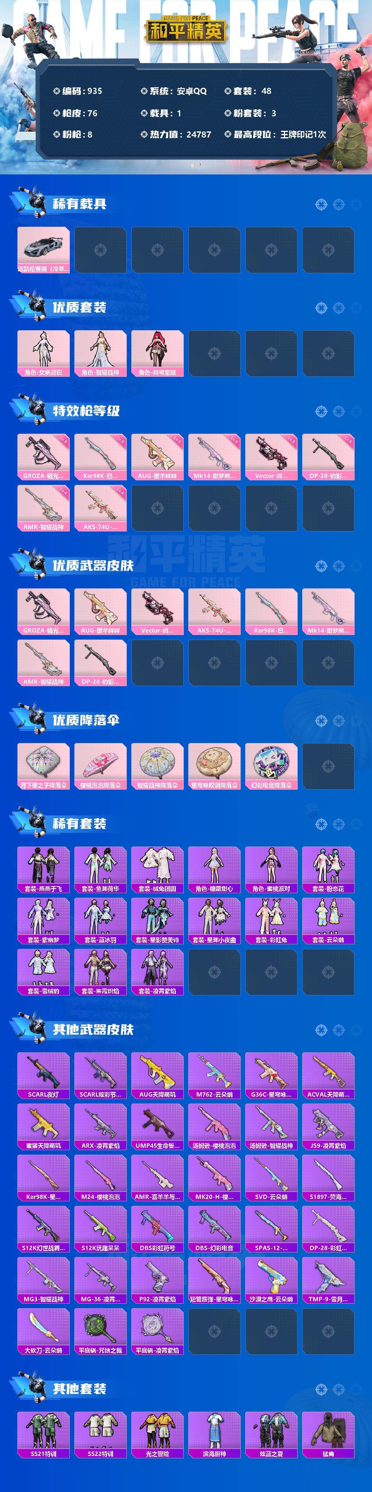 【935】【商品标题】:安卓 手Q-3粉装-8特效枪-1载具-0粉色飞行器-24787热力值-1王牌印记-48套装-76枪皮