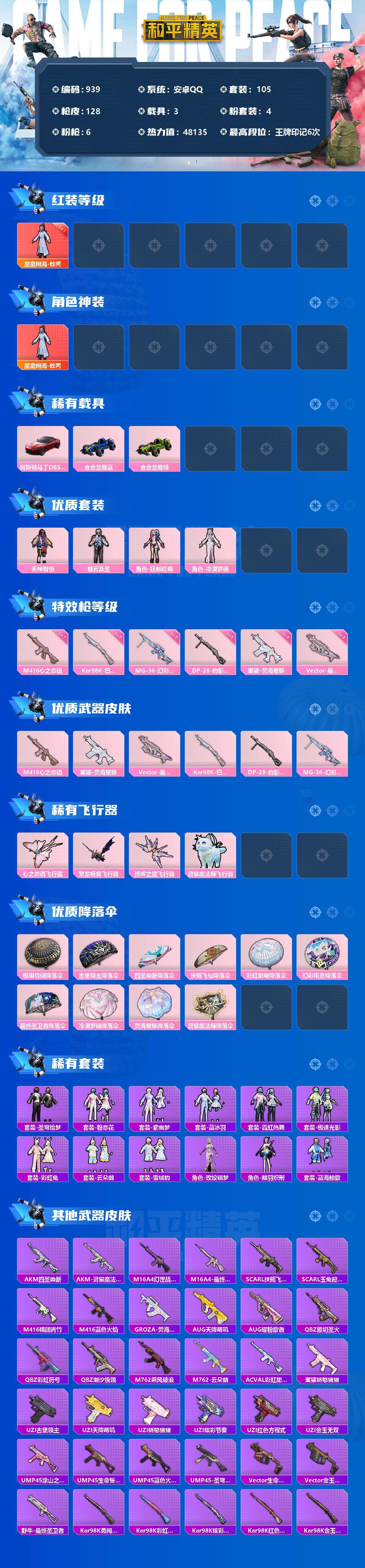 【939】【商品标题】:安卓 手Q-1神装-4粉装-6特效枪-3载具-4粉色飞行器-48135热力值-6王牌印记-105套装-128枪皮
