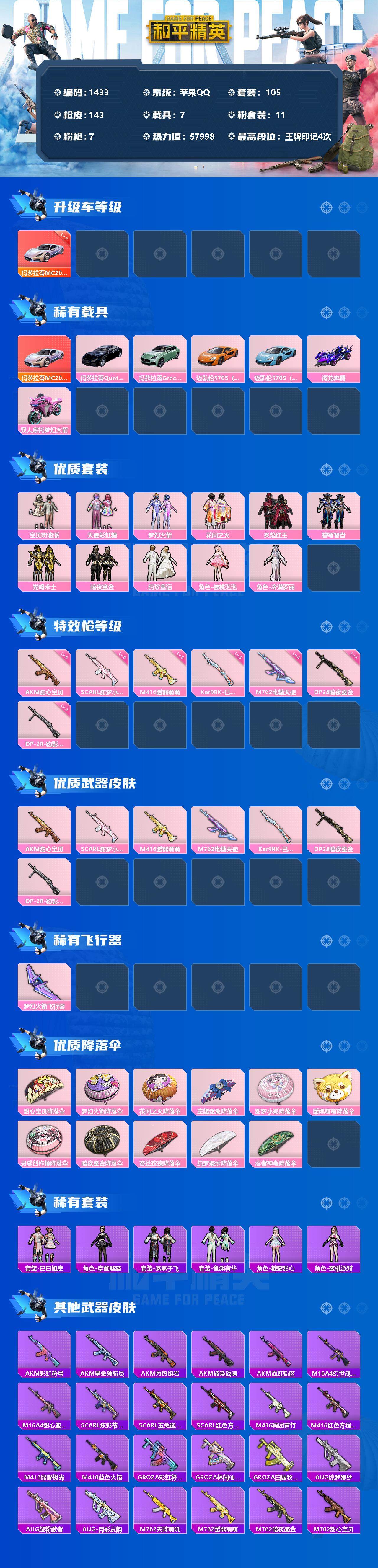 【1433】苹果 手Q-11粉装-7特效枪-7载具-1粉色飞行器-57998热力值-4王牌印记-105套装-143枪皮