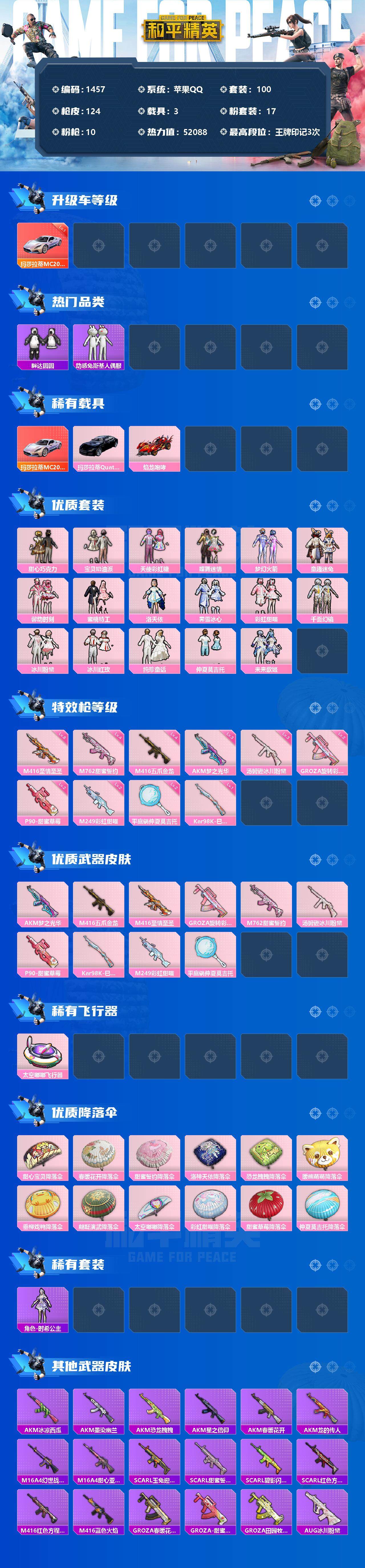 【1457】苹果 手Q-17粉装-10特效枪-3载具-2粉色飞行器-52088热力值-3王牌印记-100套装-124枪皮