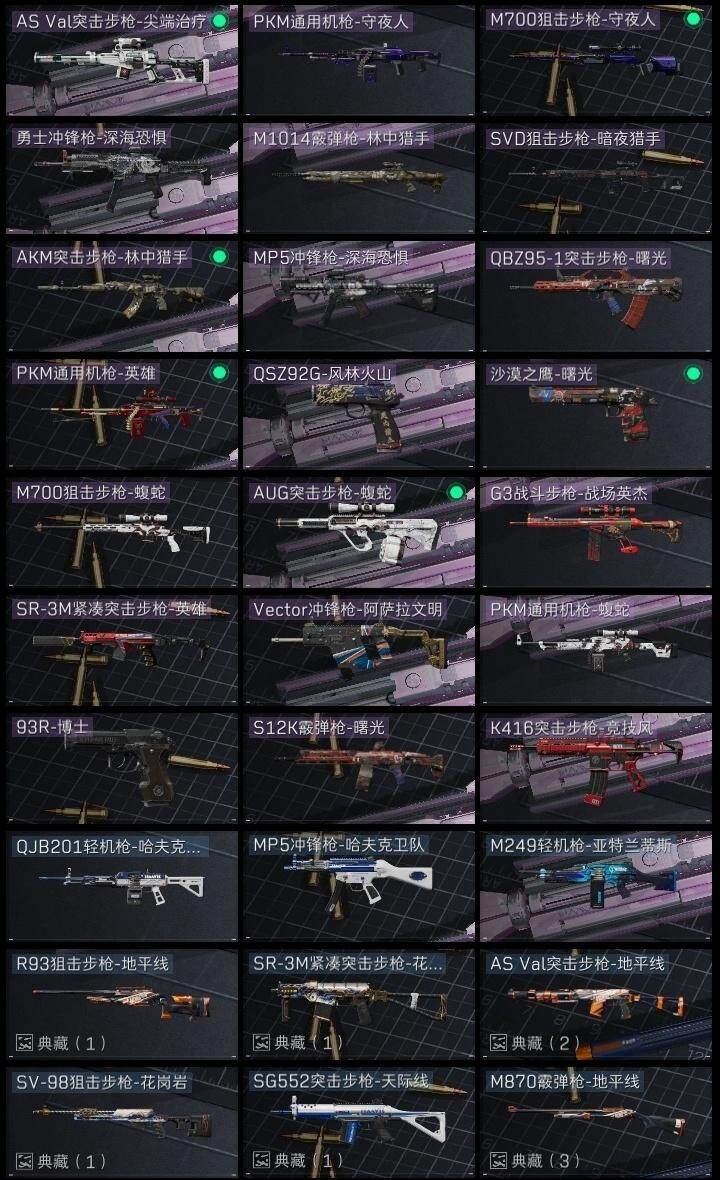 红狼-蚀金玫瑰,露娜-黑·天际线,蛊-能天使午夜邮差,蜂医-送葬人·无题密令,无名-夜鹰,近战-黑海,近战-北极星,近战-黑鹰,M4A1突击步枪-棱镜攻势,QBZ95-1突击步枪-王牌之剑,K41