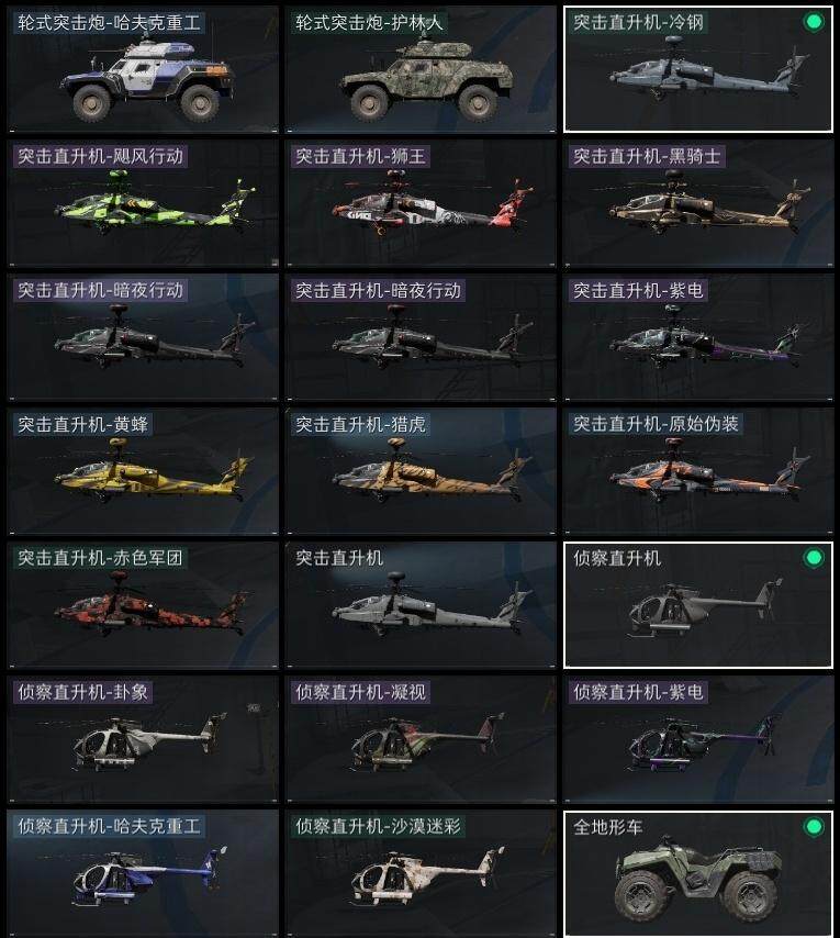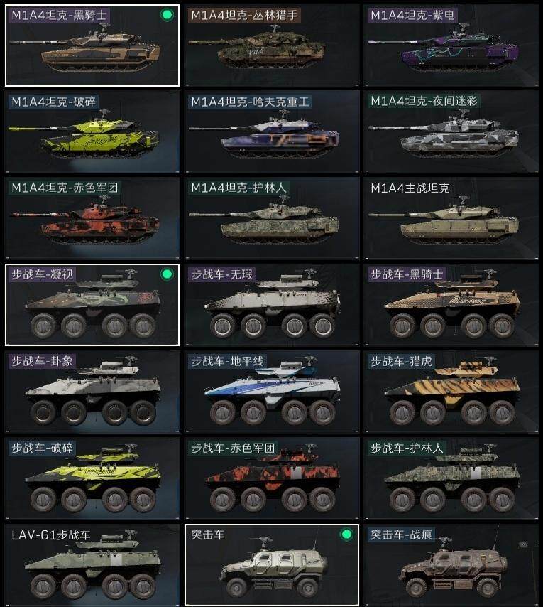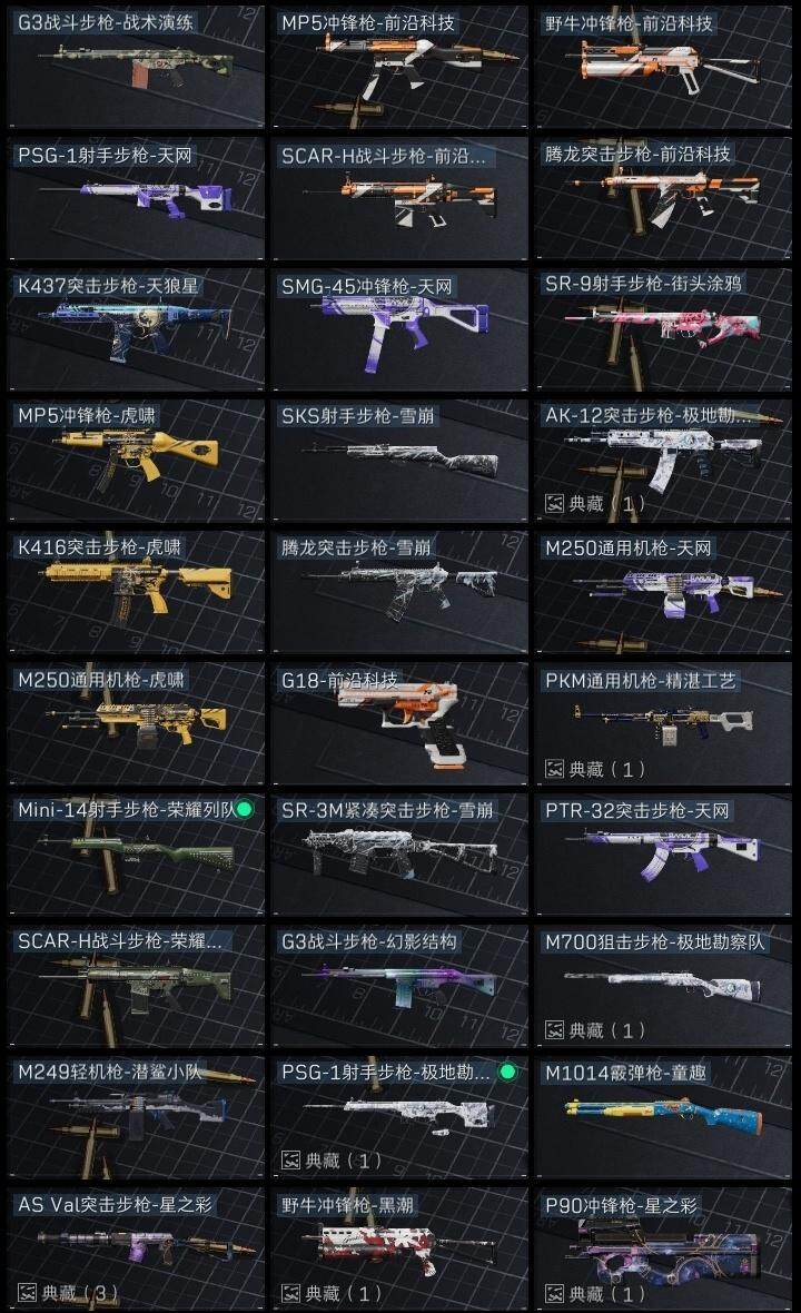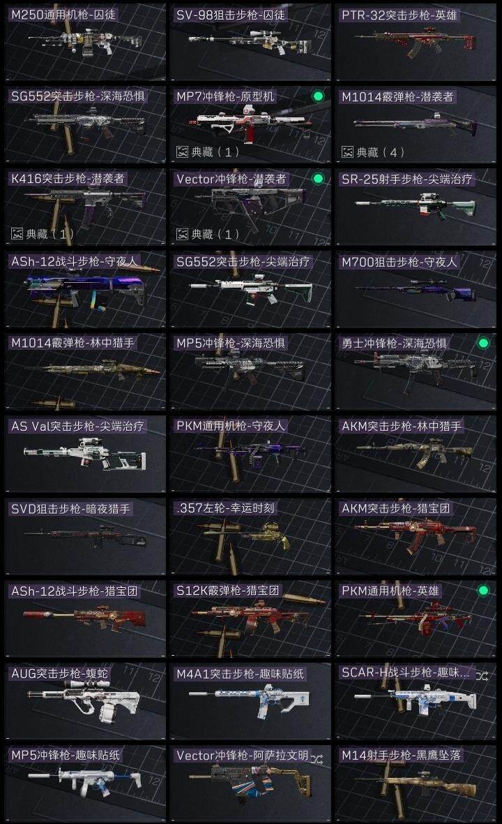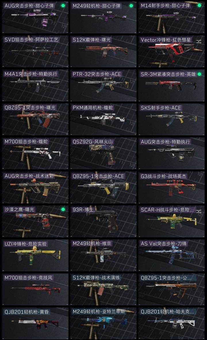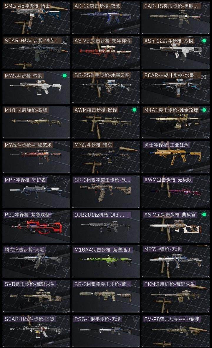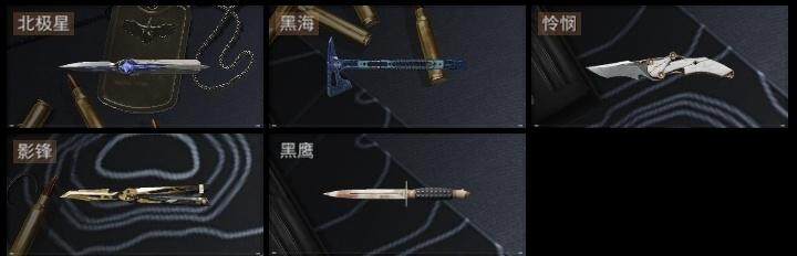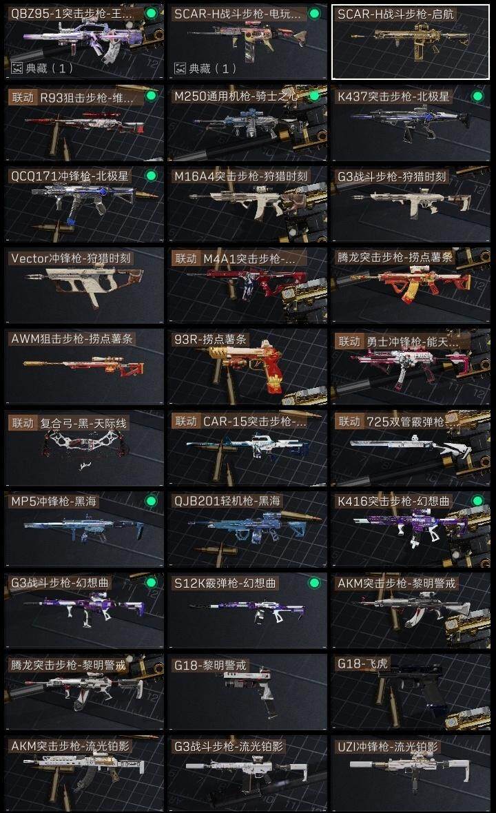 红狼-蚀金玫瑰,骇爪-水墨云图,威龙-壮志凌云,威龙-飞虎,蜂医-送葬人·无题密令,牧羊人-街头之王,无名-夜鹰,近战-怜悯,近战-影锋,近战-黑海,近战-北极星,近战-黑鹰,SCAR-H战斗