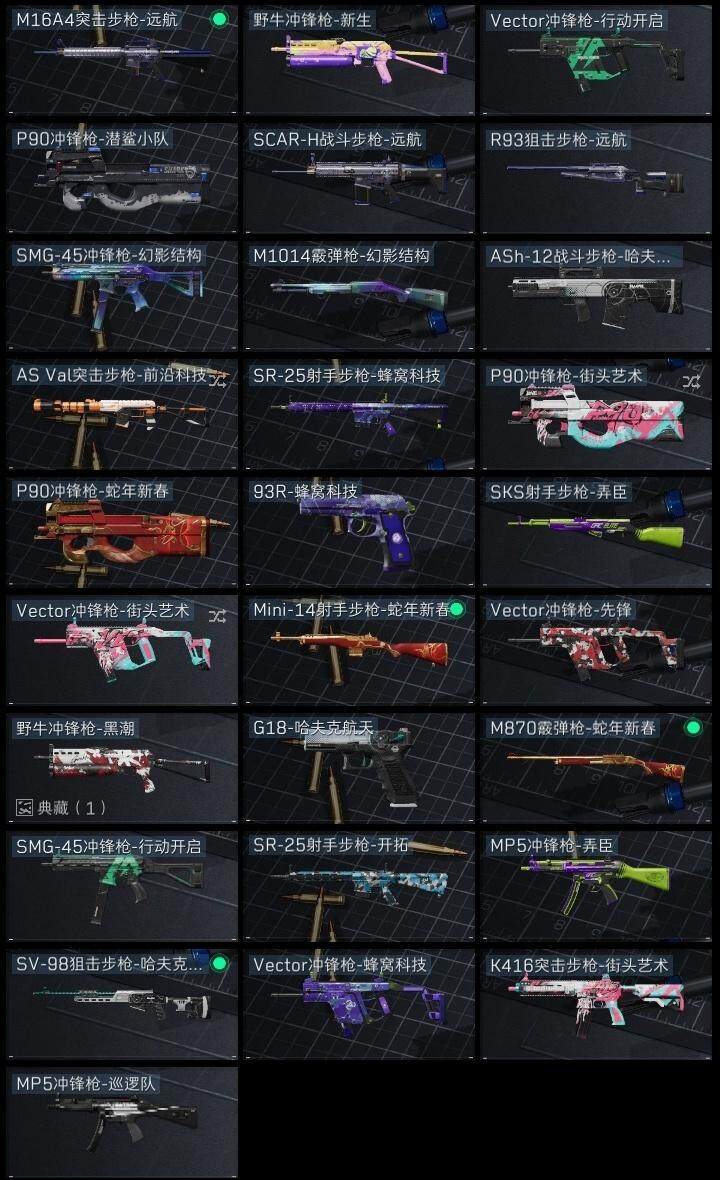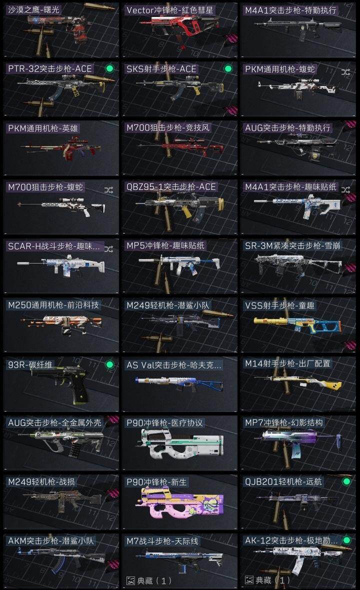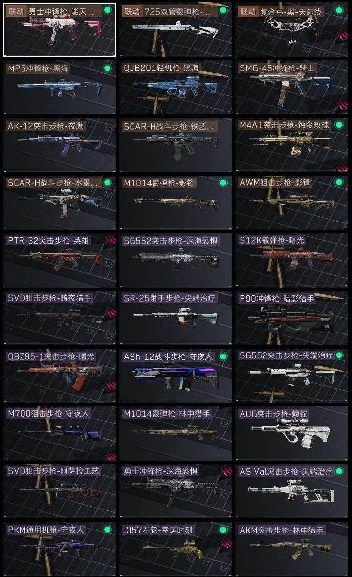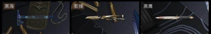 红狼-蚀金玫瑰,骇爪-水墨云图,威龙-壮志凌云,无名-夜鹰,近战-影锋,近战-黑海,近战-黑鹰,野牛冲锋枪-黑潮,M7战斗步枪-天际线,AK-12突击步枪-极地勘察队,M4A1突击步枪-蚀金玫瑰,AK-12