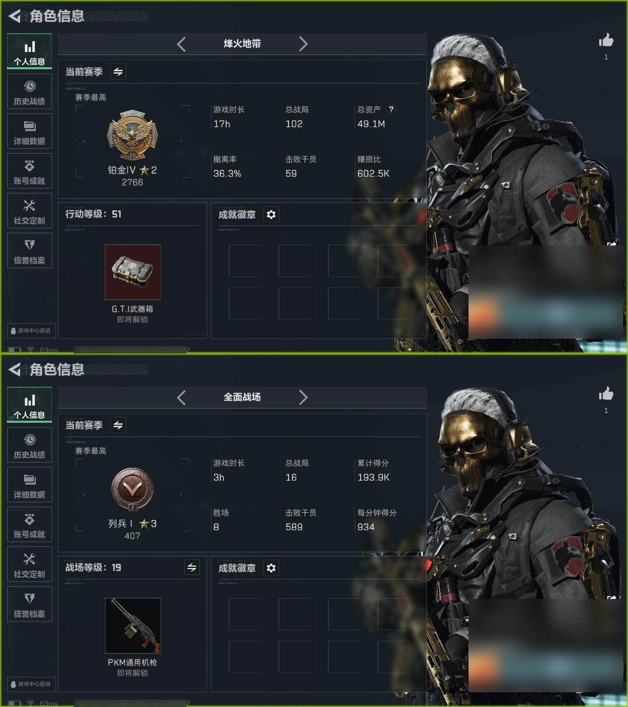 【1016】总资产:49.1M, 哈夫币:521911 ;总资产(M):49M/哈夫币(K):521K/哈夫币(K):521K/全面战场等级:19_段位:列兵/烽火地带等级:51_段位:铂金
