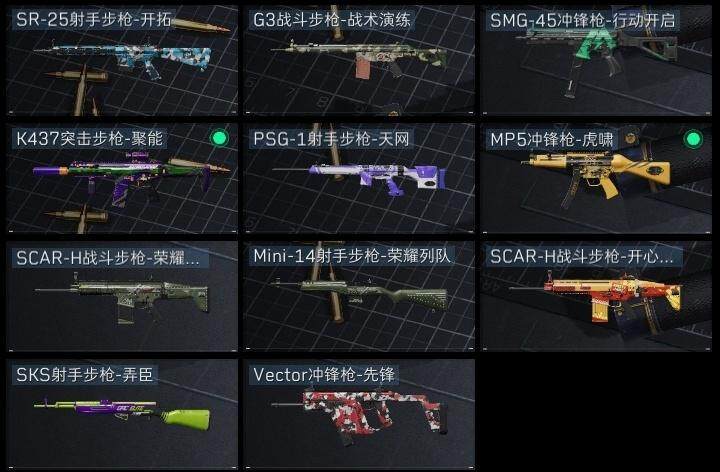 蛊-能天使午夜邮差,近战-黑鹰,As Val突击步枪-星之彩,M4A1突击步枪-蚀金玫瑰,M4A1突击步枪-阿米娅,ASh-12战斗步枪-鹅鸭杀,M16A4突击步枪-狩猎时刻,SCAR-H战斗步枪-水墨