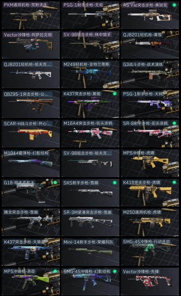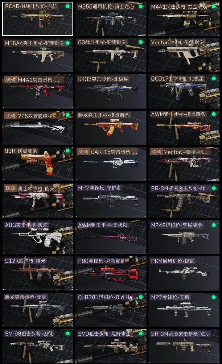 红狼-蚀金玫瑰,蛊-能天使午夜邮差,蜂医-送葬人·无题密令,近战-北极星,近战-黑鹰,M4A1突击步枪-蚀金玫瑰,M4A1突击步枪-阿米娅,M16A4突击步枪-狩猎时刻,G3战斗步枪-狩猎时刻