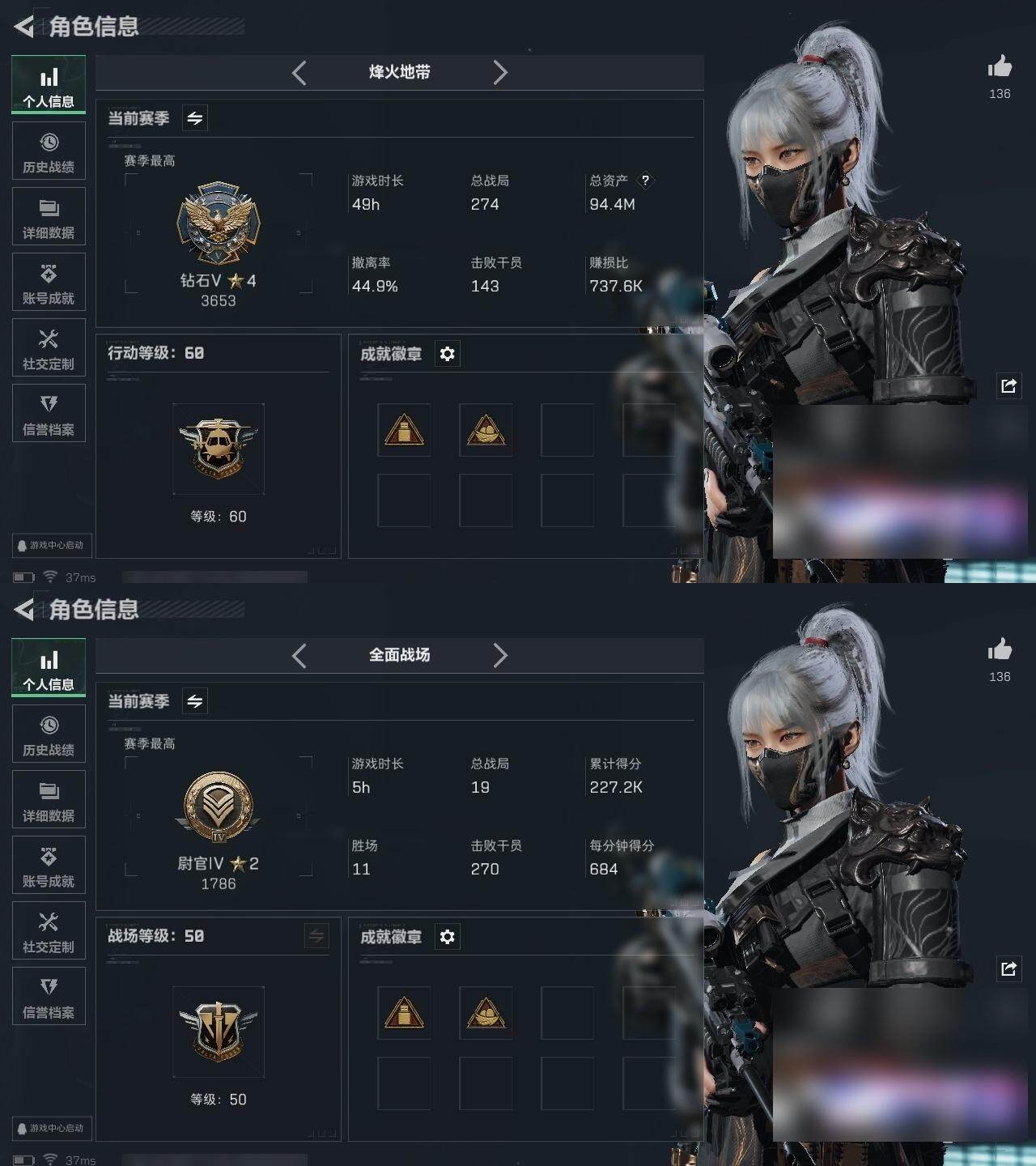 【1044】总资产:94.4M, 哈夫币:17665K ;总资产(M):94M/哈夫币(K):17665K/哈夫币(K):17665K/全面战场等级:50_段位:尉官/烽火地带等级:60_段位:钻石