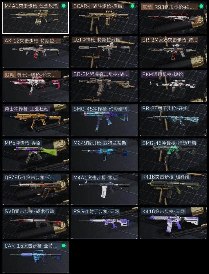 红狼-蚀金玫瑰,近战-黑鹰,M4A1突击步枪-蚀金玫瑰,AK-12突击步枪-特斯拉线圈,UZI冲锋枪-特斯拉线圈,SR-3M紧凑突击步枪-特斯拉线圈,R93狙击步枪-维什戴尔,勇士冲锋枪-工业狂潮,PKM