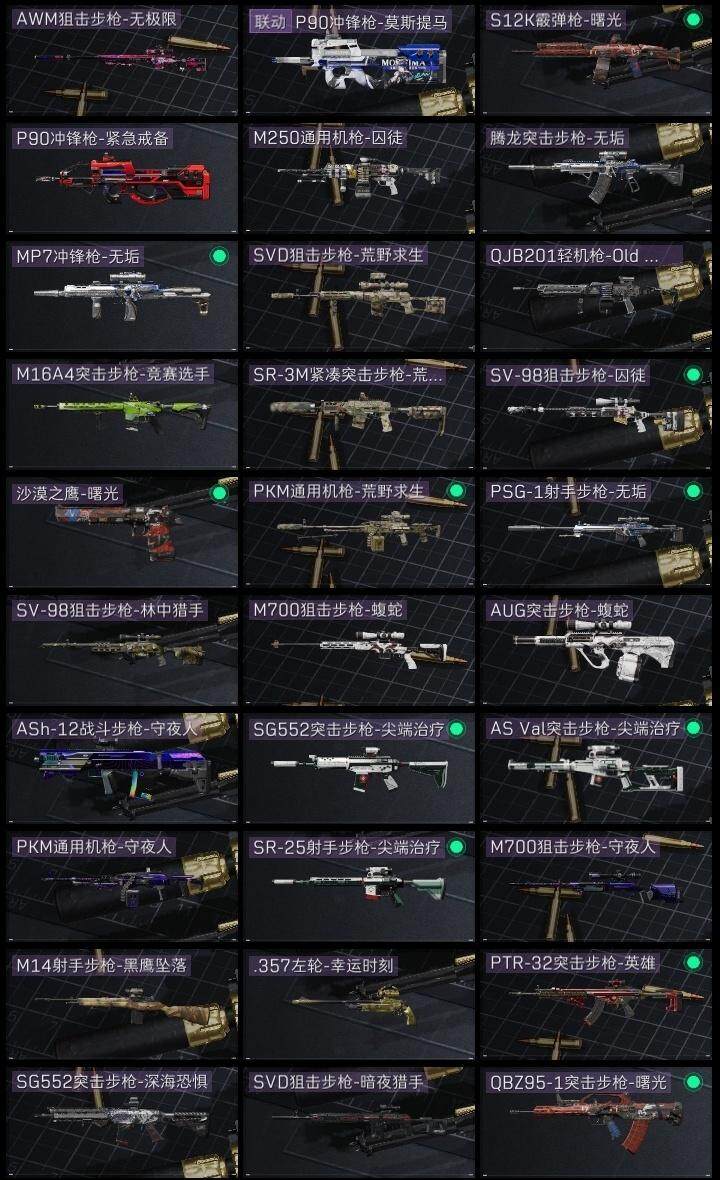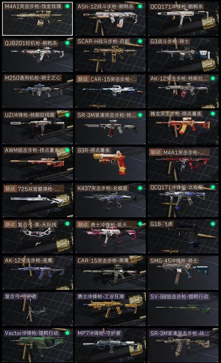 红狼-蚀金玫瑰,露娜-黑·天际线,威龙-飞虎,蜂医-送葬人·无题密令,无名-夜鹰,近战-北极星,近战-黑鹰,AK-12突击步枪-阿萨拉卫队,M4A1突击步枪-蚀金玫瑰,M4A1突击步枪-阿米娅,A