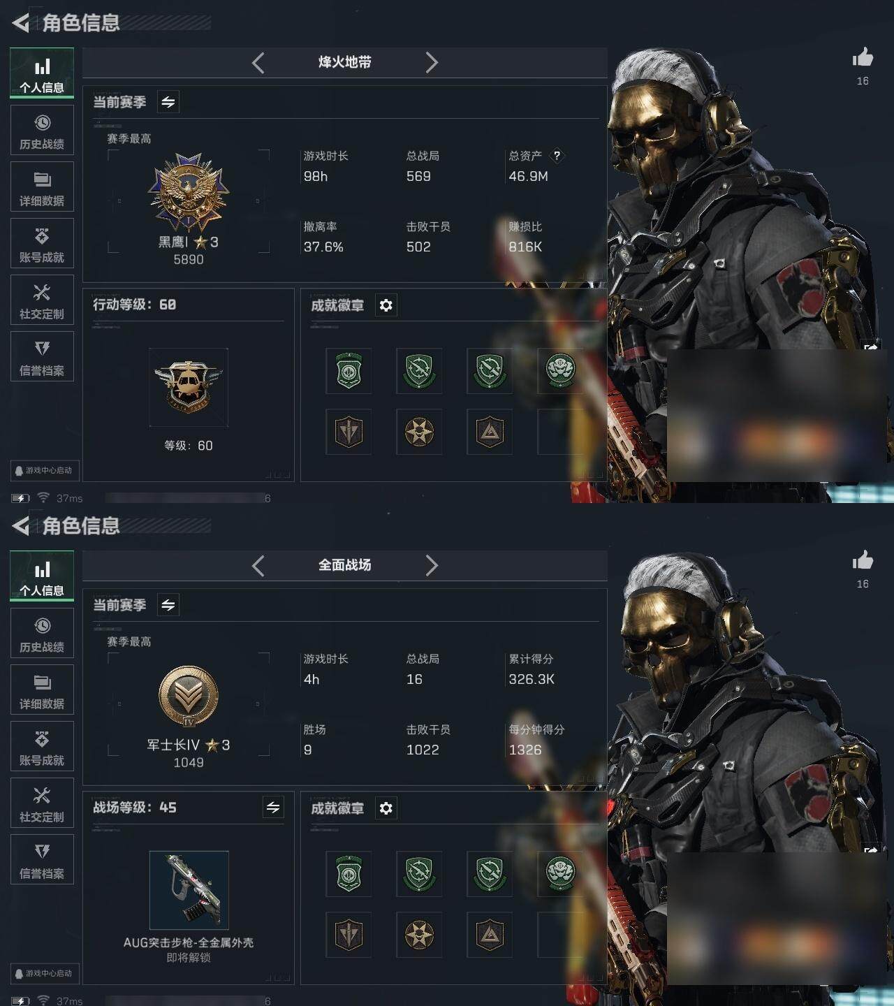 【1097】总资产:46.9M, 哈夫币:3460K ;总资产(M):46M/哈夫币(K):3460K/哈夫币(K):3460K/全面战场等级:45_段位:军士长/烽火地带等级:60_段位:黑鹰
