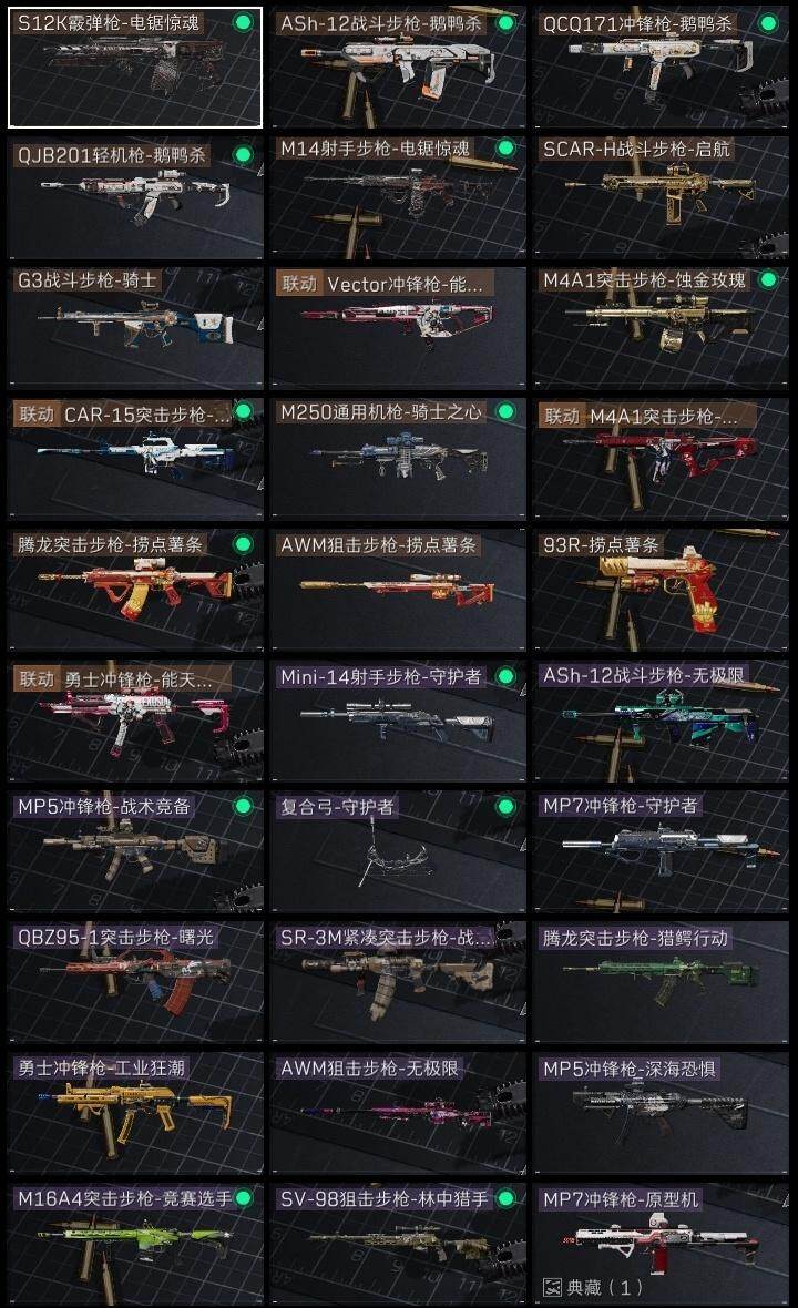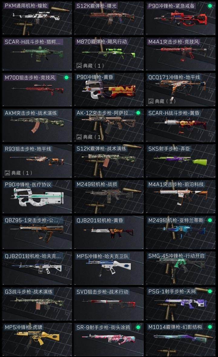 红狼-蚀金玫瑰,蛊-能天使午夜邮差,近战-黑鹰,M870霰弹枪-飓风行动,MP7冲锋枪-原型机,AK-12突击步枪-阿萨拉卫队,M870霰弹枪-阿萨拉卫队,QCQ171冲锋枪-地平线,R93狙击步枪-地