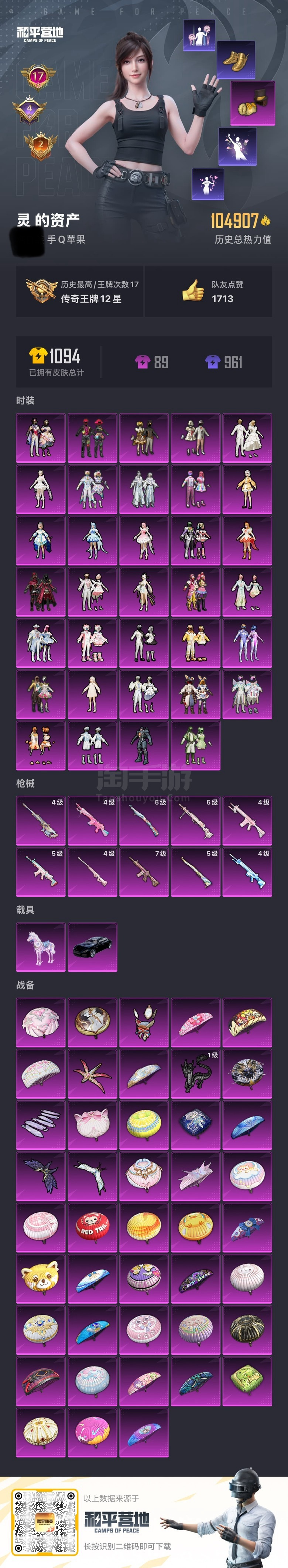 【1488】苹果 手Q-1神装-28粉装-11特效枪-8载具-5粉色飞行器-147221热力值-16王牌印记-315套装-366枪皮