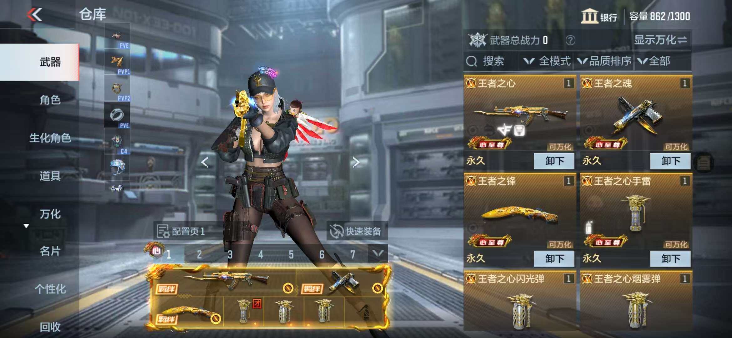 心至尊/6王者/王心/王魂/王锋/七色宝葫-黑耀/V7-84V-97级 1同框 1至尊 心至尊 王者之心 王者之魂 王者之锋 1套王者投掷 M4A1-七色宝葫 - 黑耀 M4A1-雷神 - RGB骇客 M4A1-黑龙 - 苏城钰 M4A1-海骑士 巴雷特-毁灭 - EP CBJ-MS-毒蜂 地狱火 角色 炽天使-X 零-新生 武媚 月神 洛伊 音效卡 现代战场