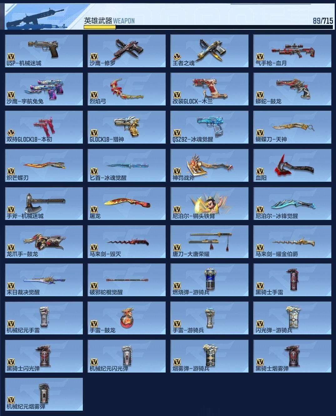 贵族等级: V1 v武器: M4A1-冰锋觉醒,M4A1-海骑士,AK47-血武士,M4A1-赛博雷神,AK47-猩红传说,AUG-机械纪元,AK47-机械迷城,AK47-沙漠领主,M4A1-死神,M4A1-黑骑士,AK47-无影,M4A1-雷神,98K-黑骑士,09式狙-天神,巴雷特-极光,巴雷特-毁灭,加特林-蟒蛇,双持斯泰尔-天使,寒霜烈龙,汤姆逊-烈龙,地狱火,沙鹰-修罗,尼泊尔-铜头铁