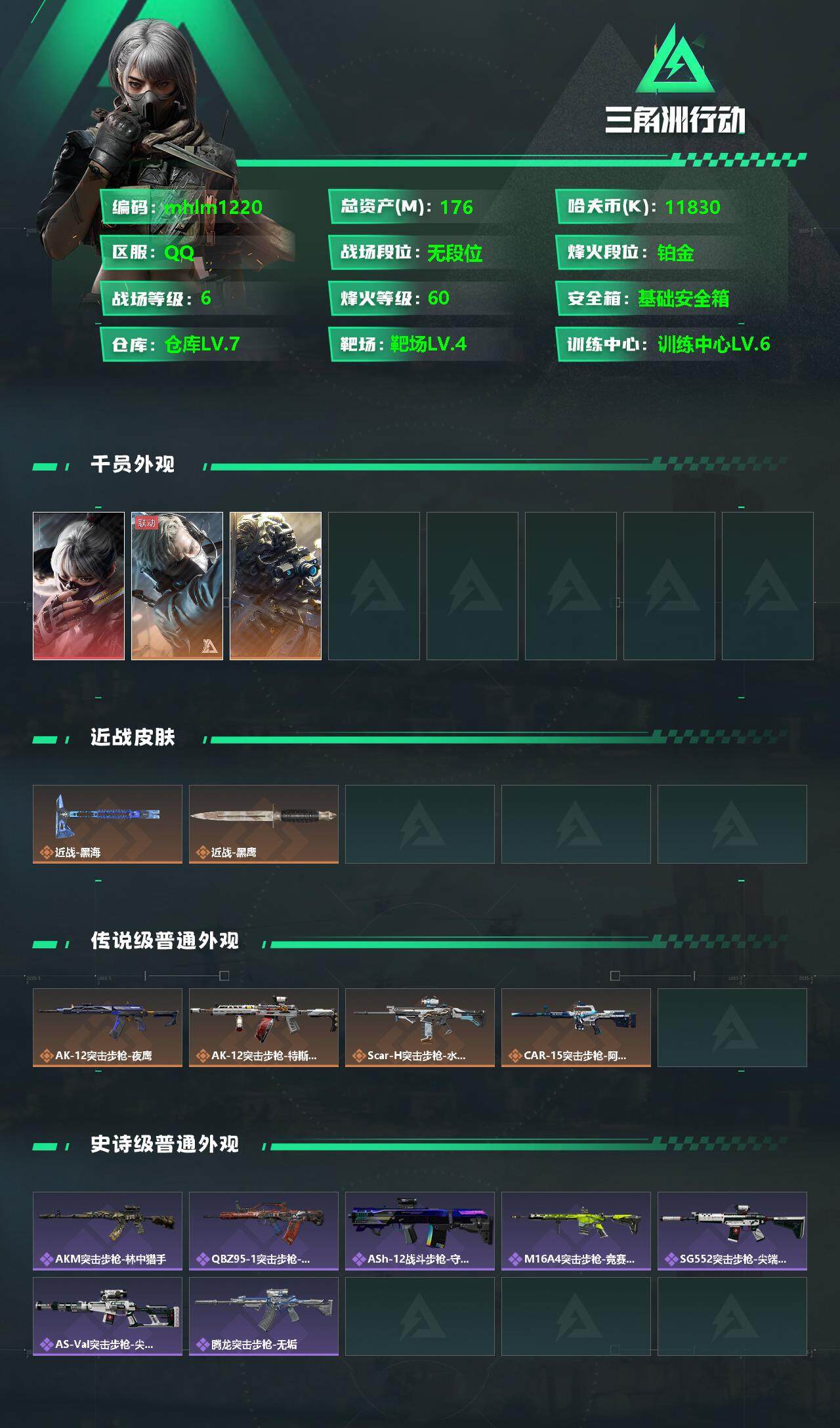 【mhlm1220】总资产:175.5M,哈夫币:1183W,武器皮肤123,烽火60级:铂金,战场6级:无段位,通行证1级:通行证免费版 【安全箱】基础安全箱;【特勤处等级】仓库LV.7,指挥中心LV.5,训练中心LV.6,靶场LV.4,潜水中心LV.1,收藏室LV.1;【干员皮肤3】:骇爪水墨云图,无名夜鹰,蜂医送葬人无题密令;【已有捆绑包2】:黑海捆绑包,特斯拉线圈捆绑包;【近战皮肤】:近