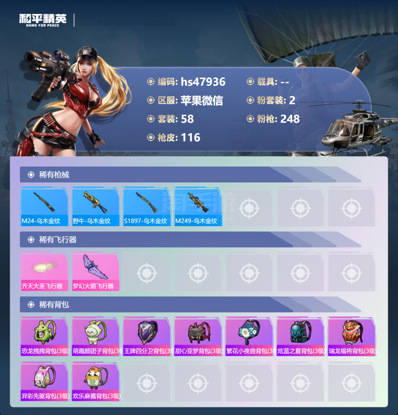 hs47936 苹果v-7王牌印记-2粉装-1特效枪-31589热力值-58套装-116枪皮 【2