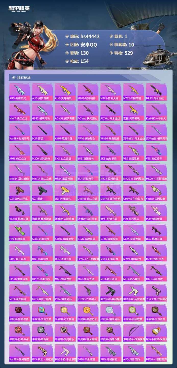 hs44443 安卓手Q-11王牌印记-10粉装-6特效枪-1载具-53084热力值-130套装-1